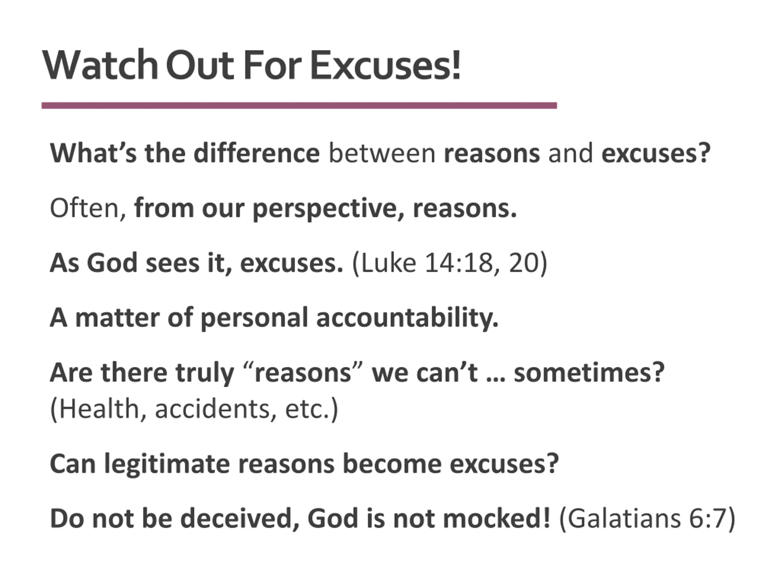 Watch Out For Excuses! What s the difference between reasons and excuses? Often, from our perspective, reasons. As God sees it, excuses. (Luke 14:18, 20) A matter of personal accountability. Are there truly reasons we can t sometimes? (Health, accidents, etc.) Can legitimate reasons become excuses? Do not be deceived, God is not mocked! (Galatians 6:7)