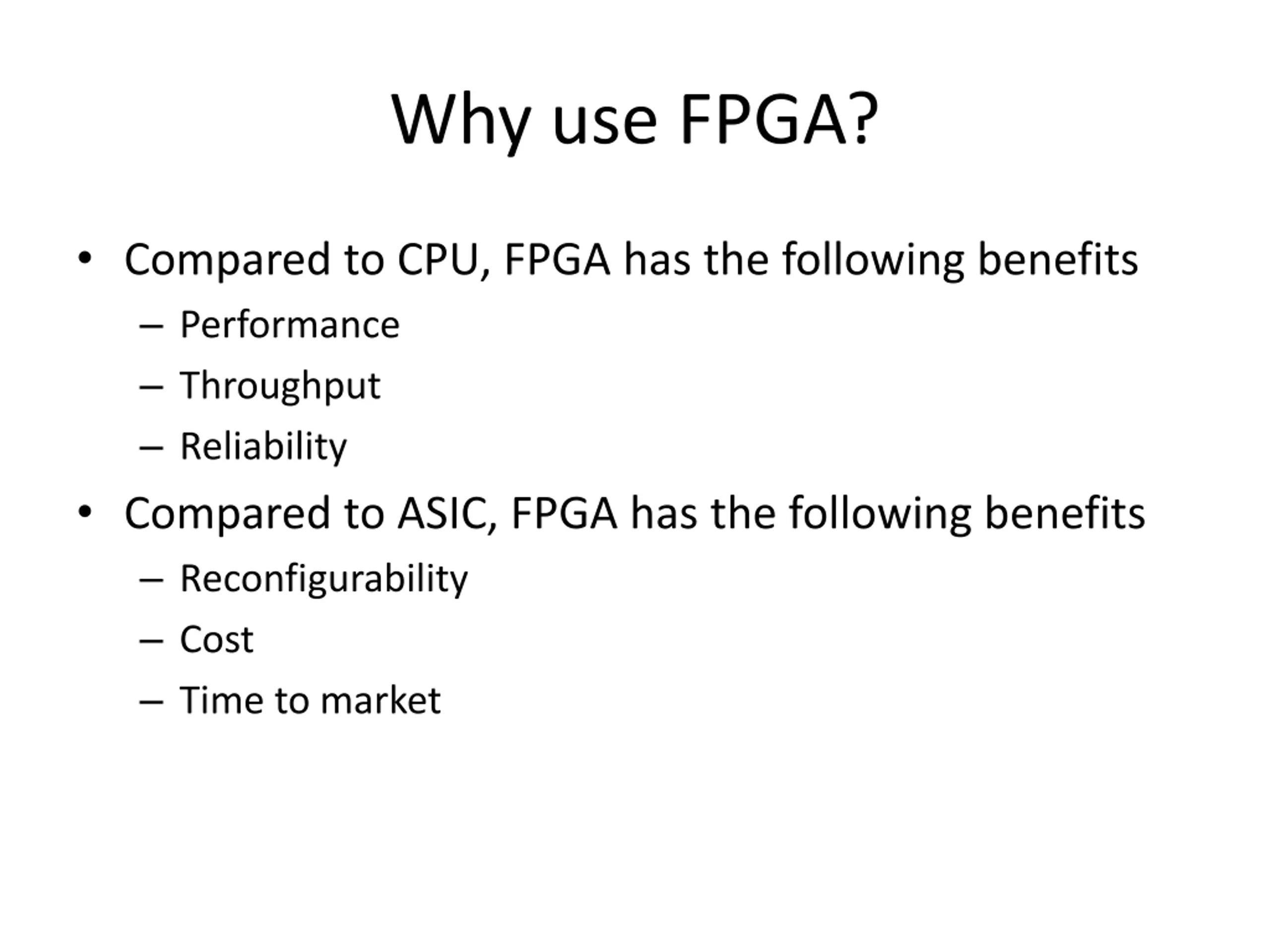 Why use FPGA? Compared to CPU, FPGA has the following benefits Performance Throughput Reliability Compared to ASIC, FPGA has the following benefits Reconfigurability Cost Time to market