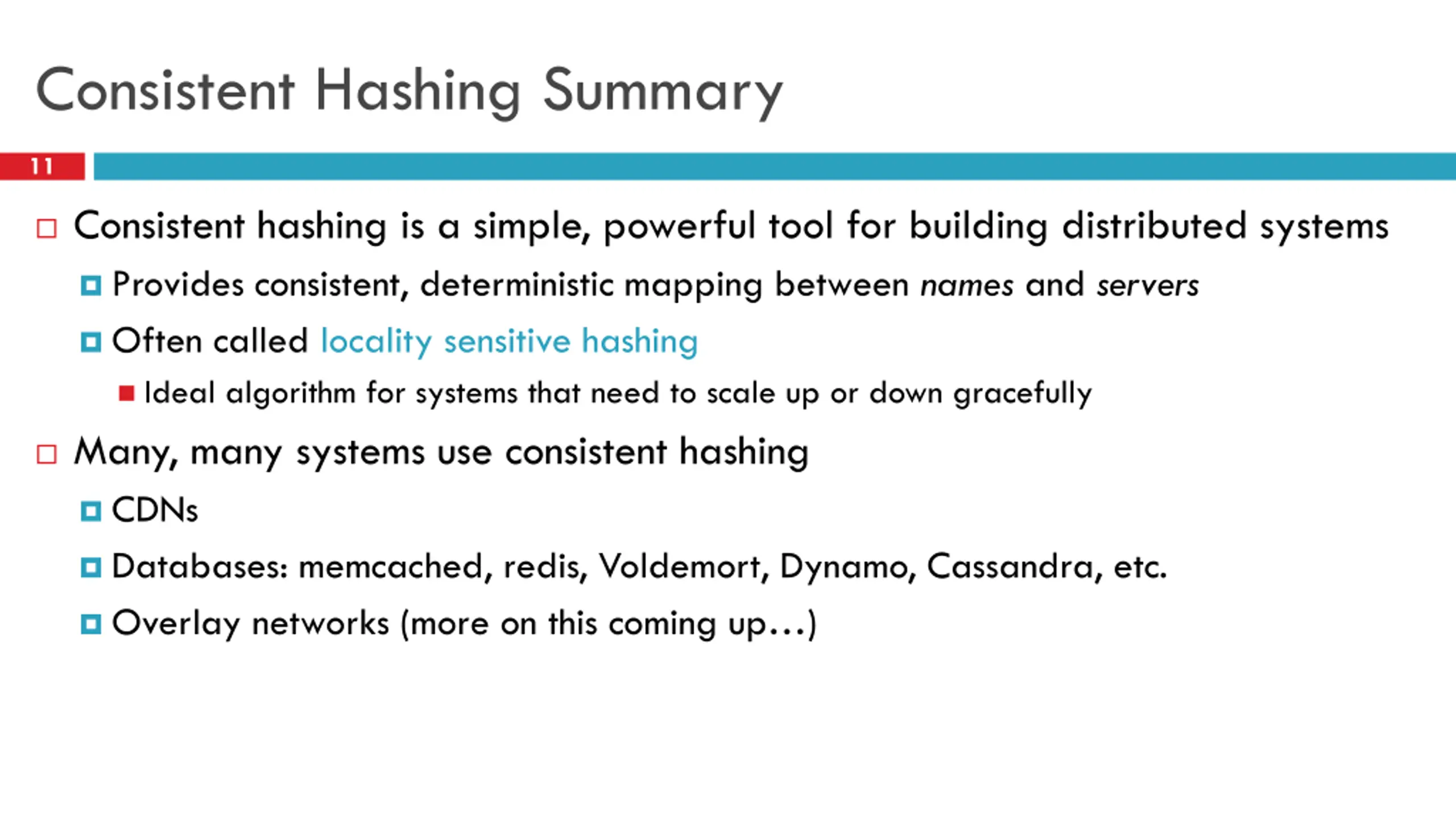 Consistent Hashing Summary 11 Consistent hashing is a simple, powerful tool for building distributed systems Provides consistent, deterministic mapping between names and servers Often called locality sensitive hashing Ideal algorithm for systems that need to scale up or down gracefully Many, many systems use consistent hashing CDNs Databases: memcached, redis, Voldemort, Dynamo, Cassandra, etc. Overlay networks (more on this coming up )