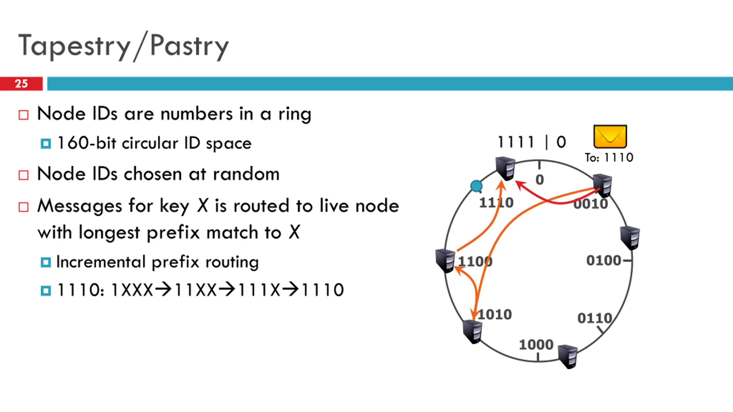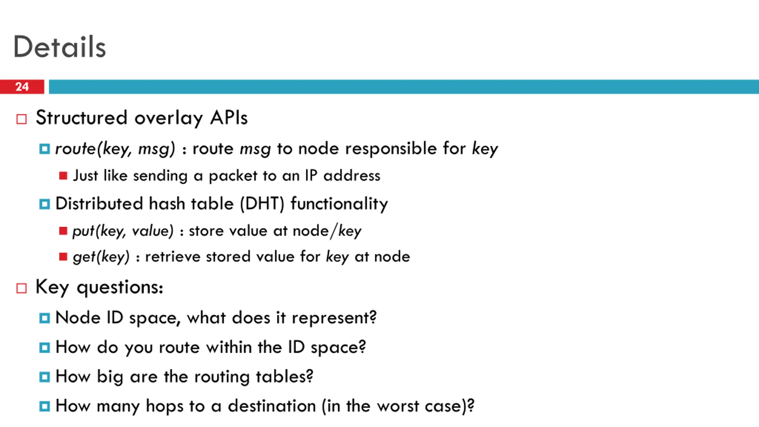Details 24 Structured overlay APIs route(key, msg) : route msg to node responsible for key Just like sending a packet to an IP address Distributed hash table (DHT) functionality put(key, value) : store value at node/key get(key) : retrieve stored value for key at node Key questions: Node ID space, what does it represent? How do you route within the ID space? How big are the routing tables? How many hops to a destination (in the worst case)?