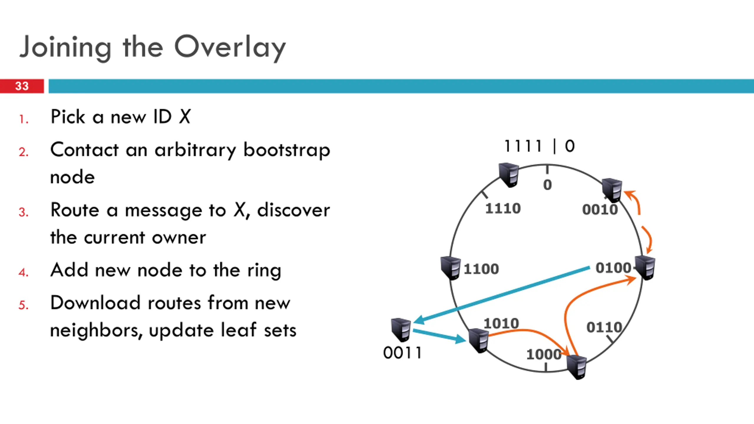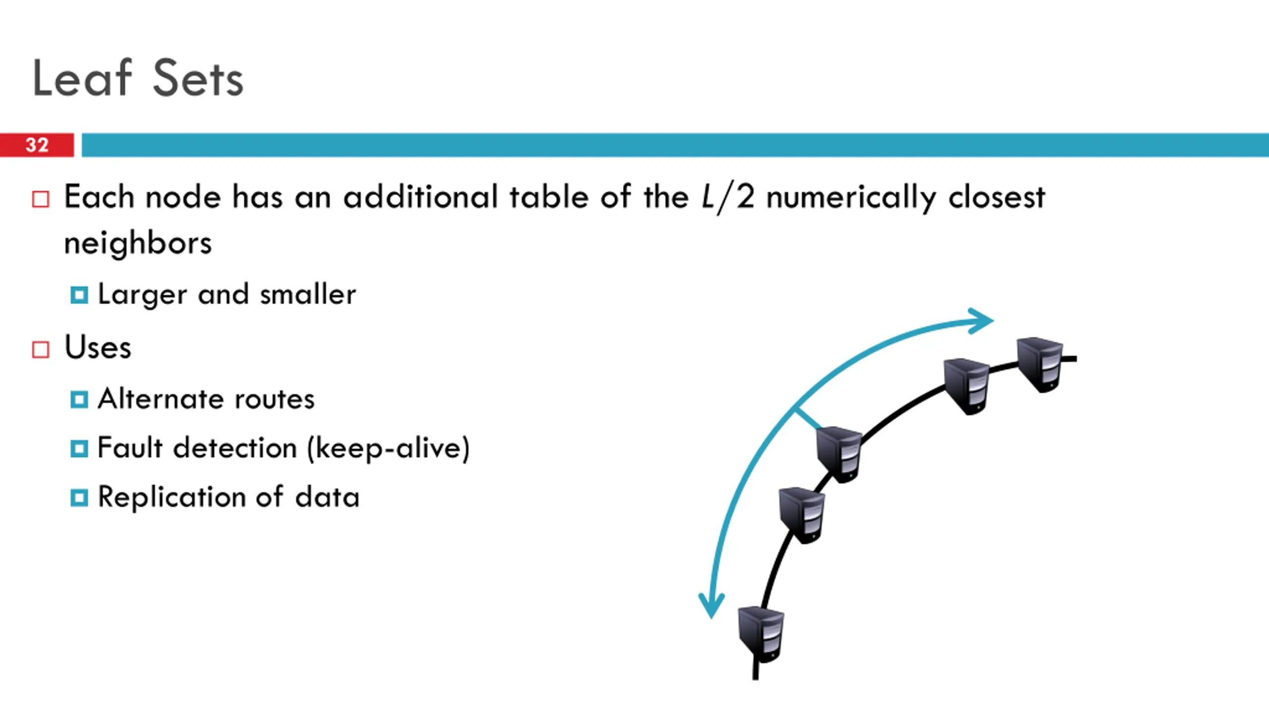 Leaf Sets 32 Each node has an additional table of the L/2 numerically closest neighbors Larger and smaller Uses Alternate routes Fault detection (keep-alive) Replication of data