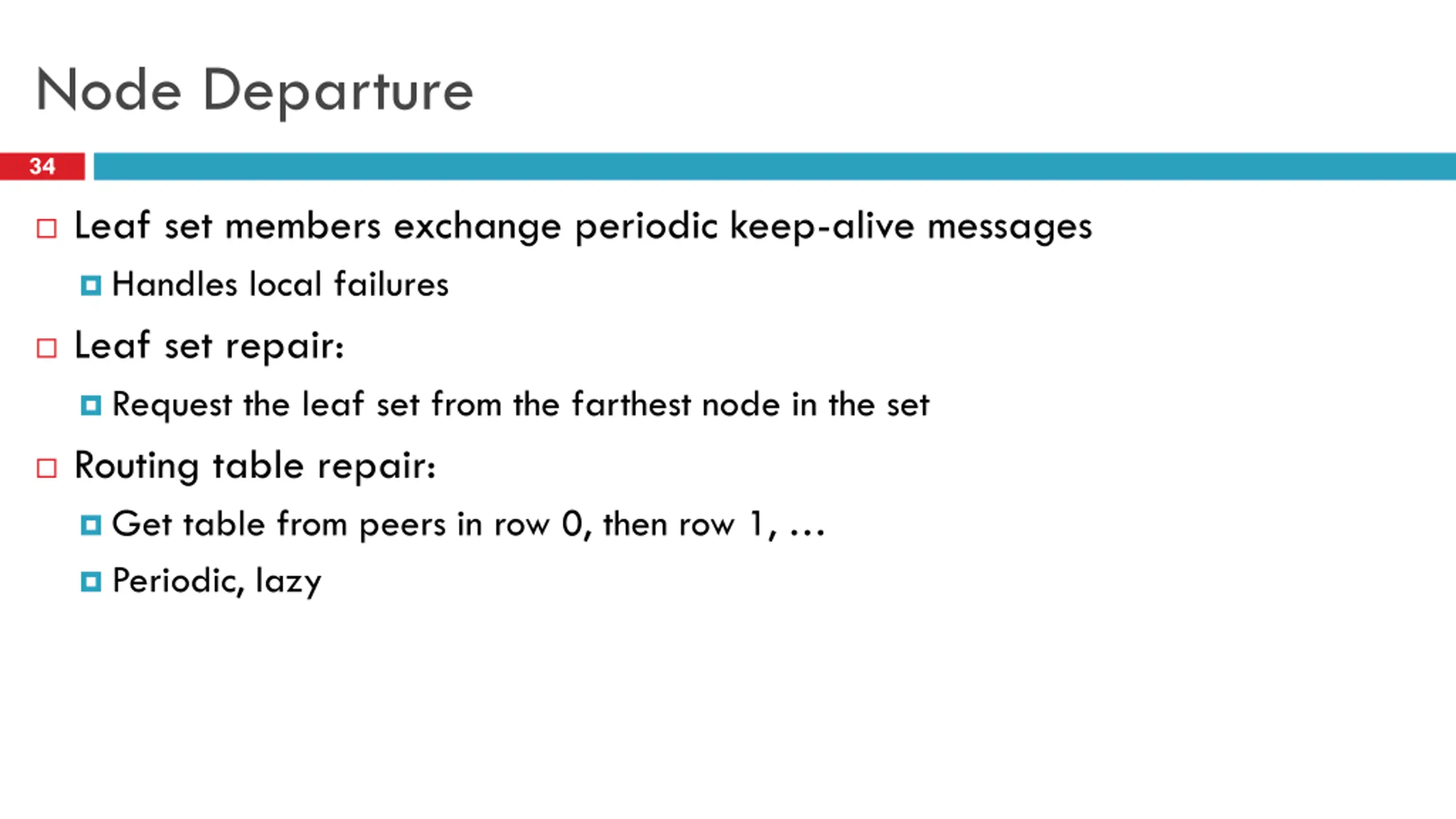 Joining the Overlay 33 Pick a new ID X Contact an arbitrary bootstrap node Route a message to X, discover the current owner Add new node to the ring Download routes from new neighbors, update leaf sets 1. 1111 | 0 2. 0 1110 0010 3. 0100 1100 4. 5. 1010 0110 0011 1000