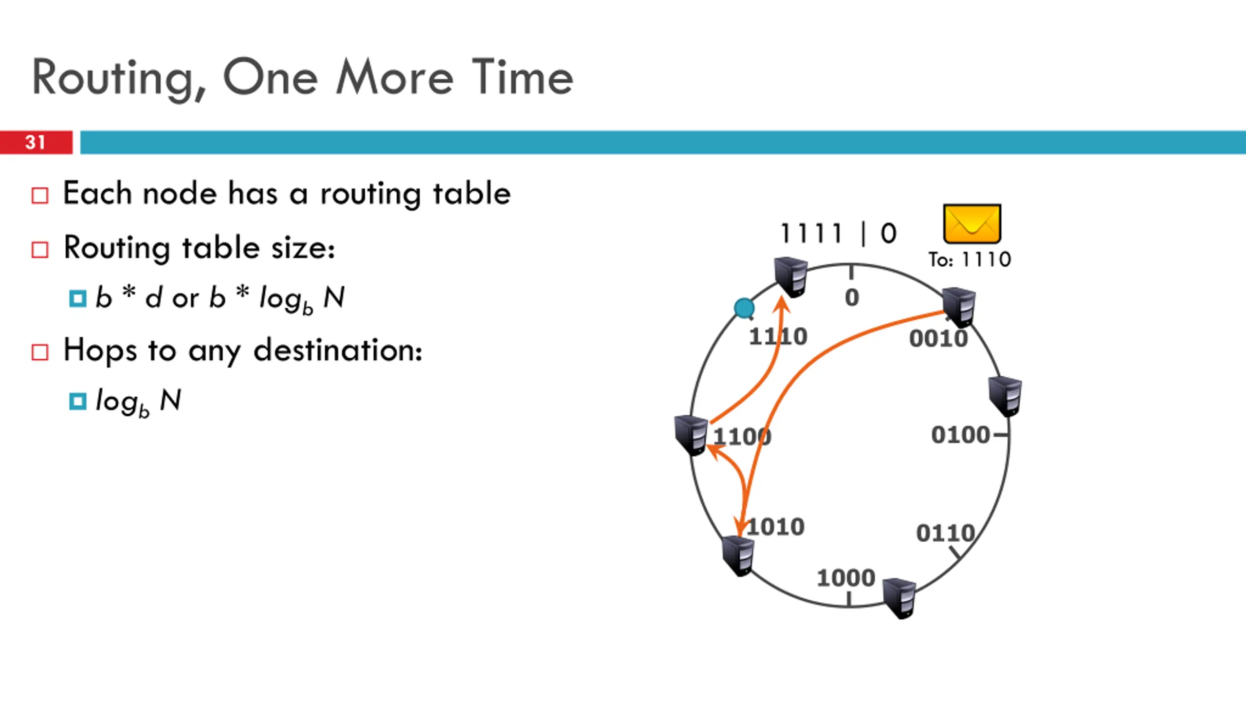 Routing Table Example 30 Hexadecimal (base-16), node ID = 65a1fc4 Each x is the IP address of a peer Row 0 Row 1 d Rows (d = length of node ID) Row 2 Row 3