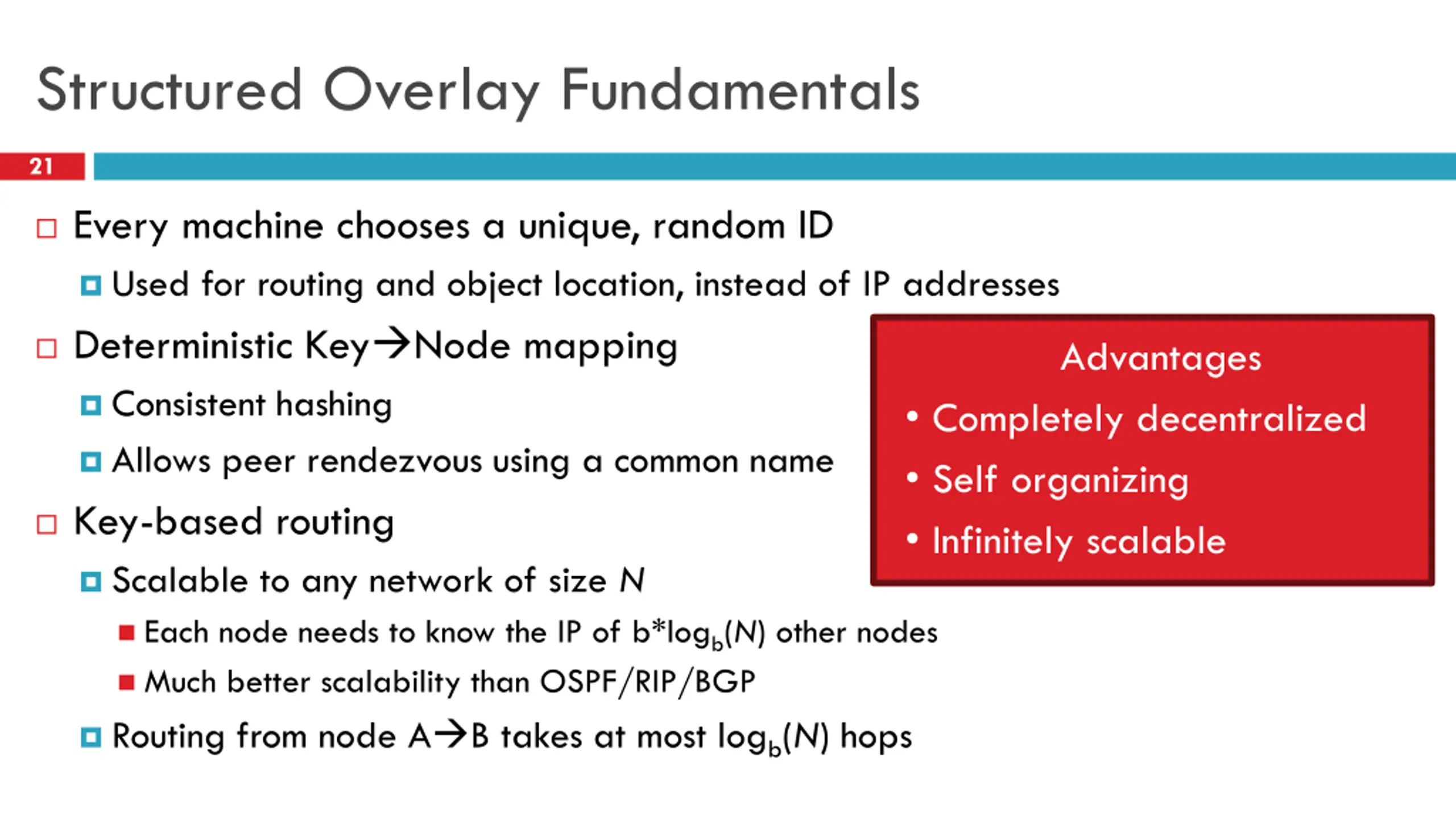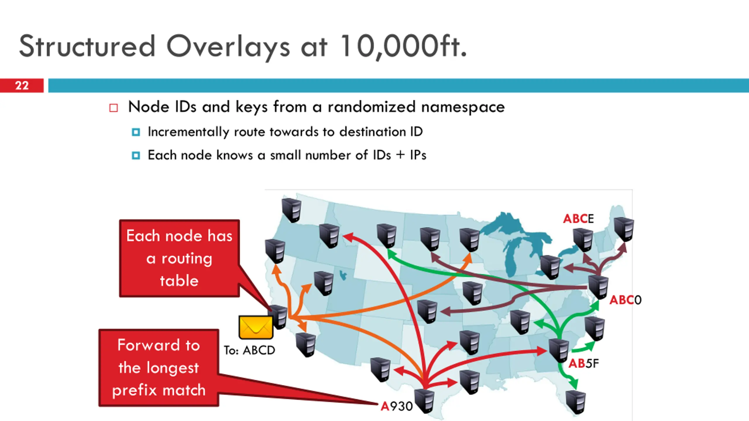 Structured Overlay Fundamentals 21 Every machine chooses a unique, random ID Used for routing and object location, instead of IP addresses Deterministic Key Node mapping Consistent hashing Allows peer rendezvous using a common name Advantages Completely decentralized Self organizing Infinitely scalable Key-based routing Scalable to any network of size N Each node needs to know the IP of b*logb(N) other nodes Much better scalability than OSPF/RIP/BGP Routing from node A B takes at most logb(N) hops