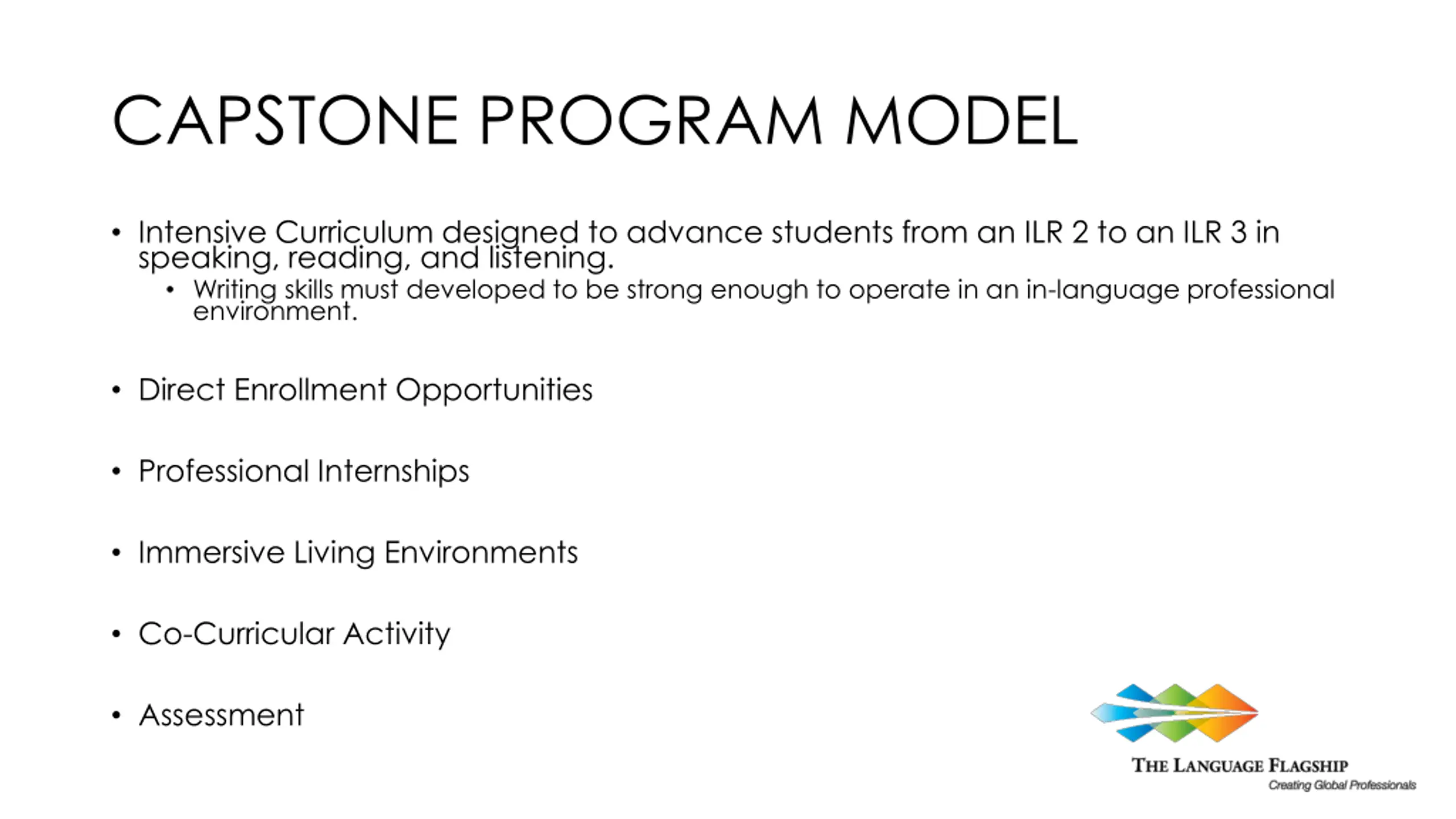 CAPSTONE PROGRAM MODEL Intensive Curriculum designed to advance students from an ILR 2 to an ILR 3 in speaking, reading, and listening. Writing skills must developed to be strong enough to operate in an in-language professional environment. Direct Enrollment Opportunities Professional Internships Immersive Living Environments Co-Curricular Activity Assessment