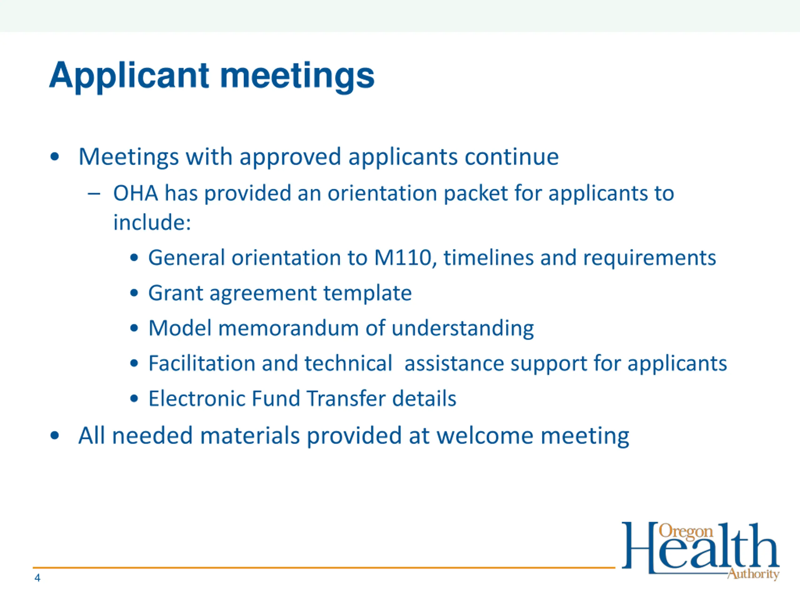 Applicant meetings Meetings with approved applicants continue OHA has provided an orientation packet for applicants to include: General orientation to M110, timelines and requirements Grant agreement template Model memorandum of understanding Facilitation and technical assistance support for applicants Electronic Fund Transfer details All needed materials provided at welcome meeting 4