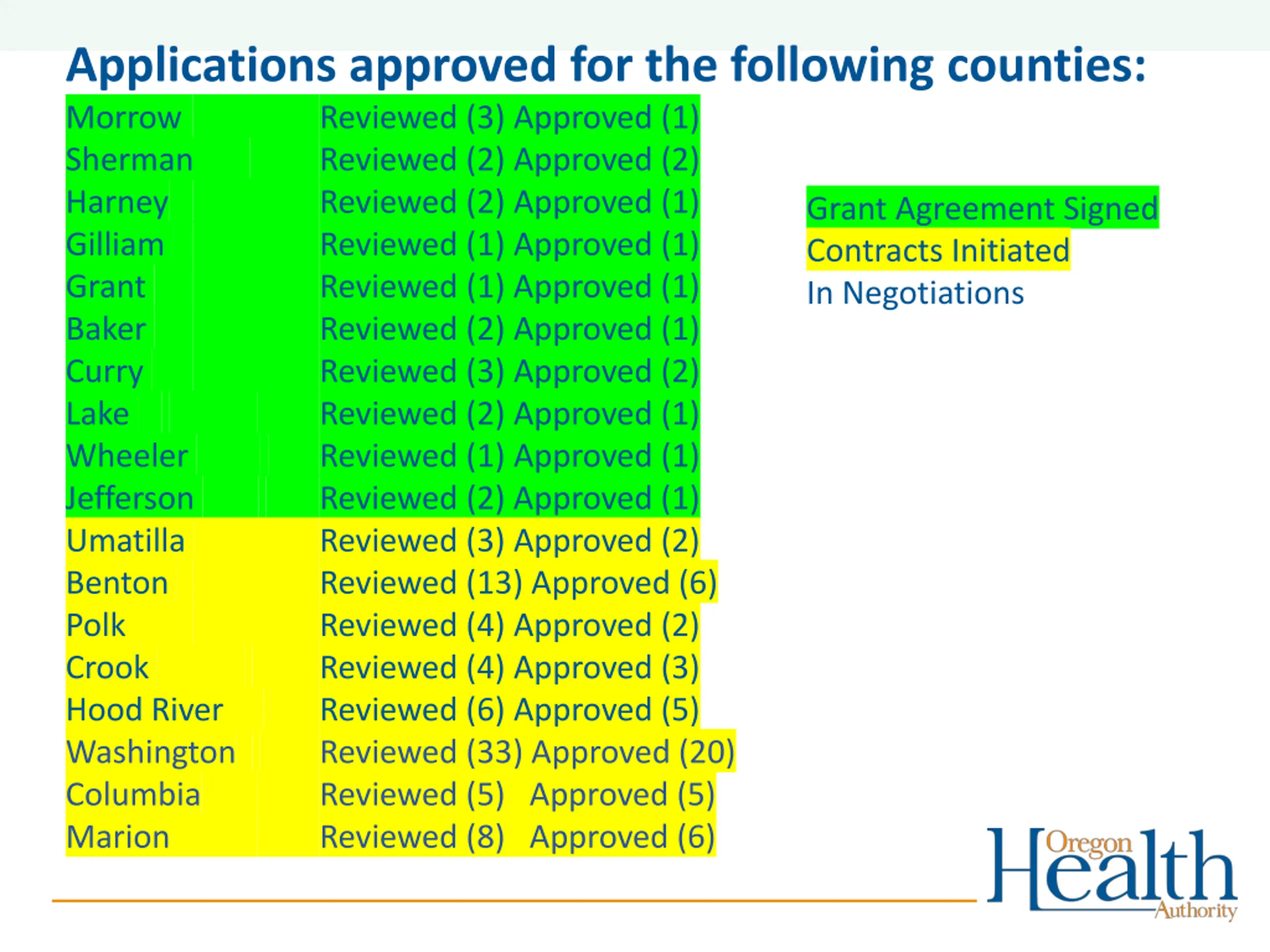 Applications approved for the following counties: Morrow Reviewed (3) Approved (1) Sherman Reviewed (2) Approved (2) Harney Reviewed (2) Approved (1) Gilliam Reviewed (1) Approved (1) Grant Reviewed (1) Approved (1) Baker Reviewed (2) Approved (1) Curry Reviewed (3) Approved (2) Lake Reviewed (2) Approved (1) Wheeler Reviewed (1) Approved (1) Jefferson Reviewed (2) Approved (1) Umatilla Reviewed (3) Approved (2) Benton Reviewed (13) Approved (6) Polk Reviewed (4) Approved (2) Crook Reviewed (4) Approved (3) Hood River Reviewed (6) Approved (5) Washington Reviewed (33) Approved (20) Columbia Reviewed (5) Approved (5) Marion Reviewed (8) Approved (6) Grant Agreement Signed Contracts Initiated In Negotiations