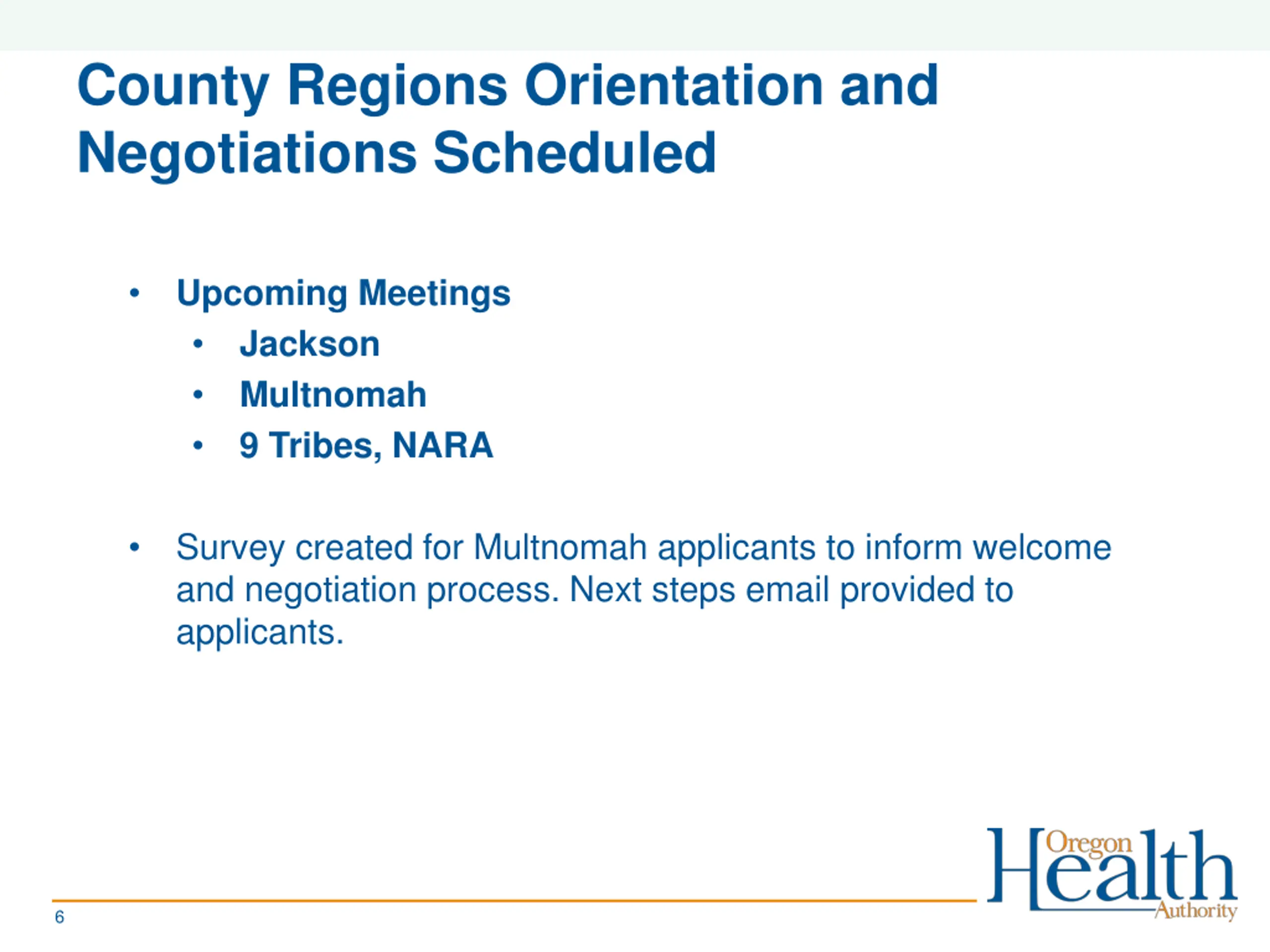 County Regions Orientation and Negotiations Scheduled Upcoming Meetings Jackson Multnomah 9 Tribes, NARA Survey created for Multnomah applicants to inform welcome and negotiation process. Next steps email provided to applicants. 6