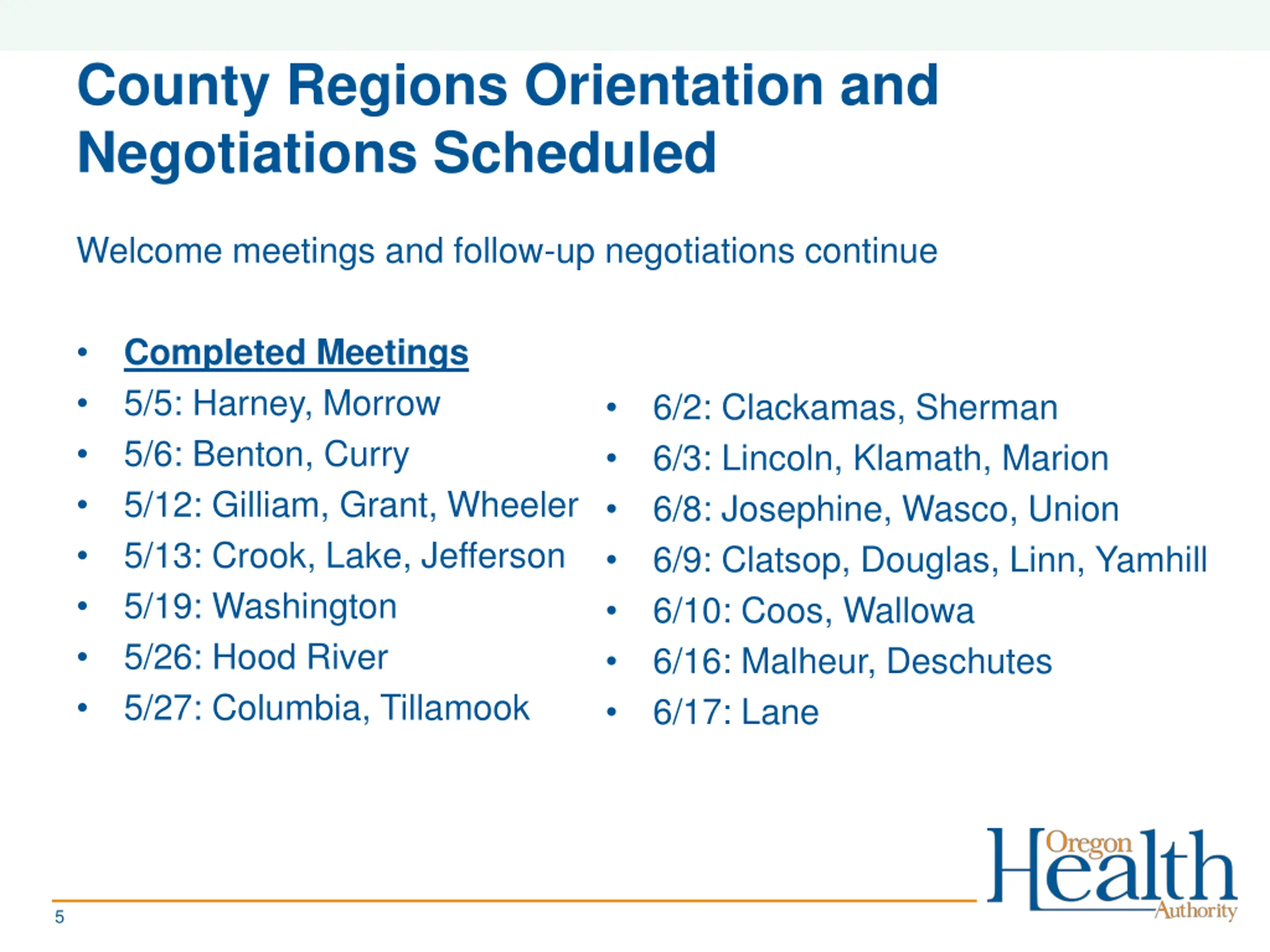 County Regions Orientation and Negotiations Scheduled Welcome meetings and follow-up negotiations continue Completed Meetings 5/5: Harney, Morrow 5/6: Benton, Curry 5/12: Gilliam, Grant, Wheeler 5/13: Crook, Lake, Jefferson 5/19: Washington 5/26: Hood River 5/27: Columbia, Tillamook 6/2: Clackamas, Sherman 6/3: Lincoln, Klamath, Marion 6/8: Josephine, Wasco, Union 6/9: Clatsop, Douglas, Linn, Yamhill 6/10: Coos, Wallowa 6/16: Malheur, Deschutes 6/17: Lane 5