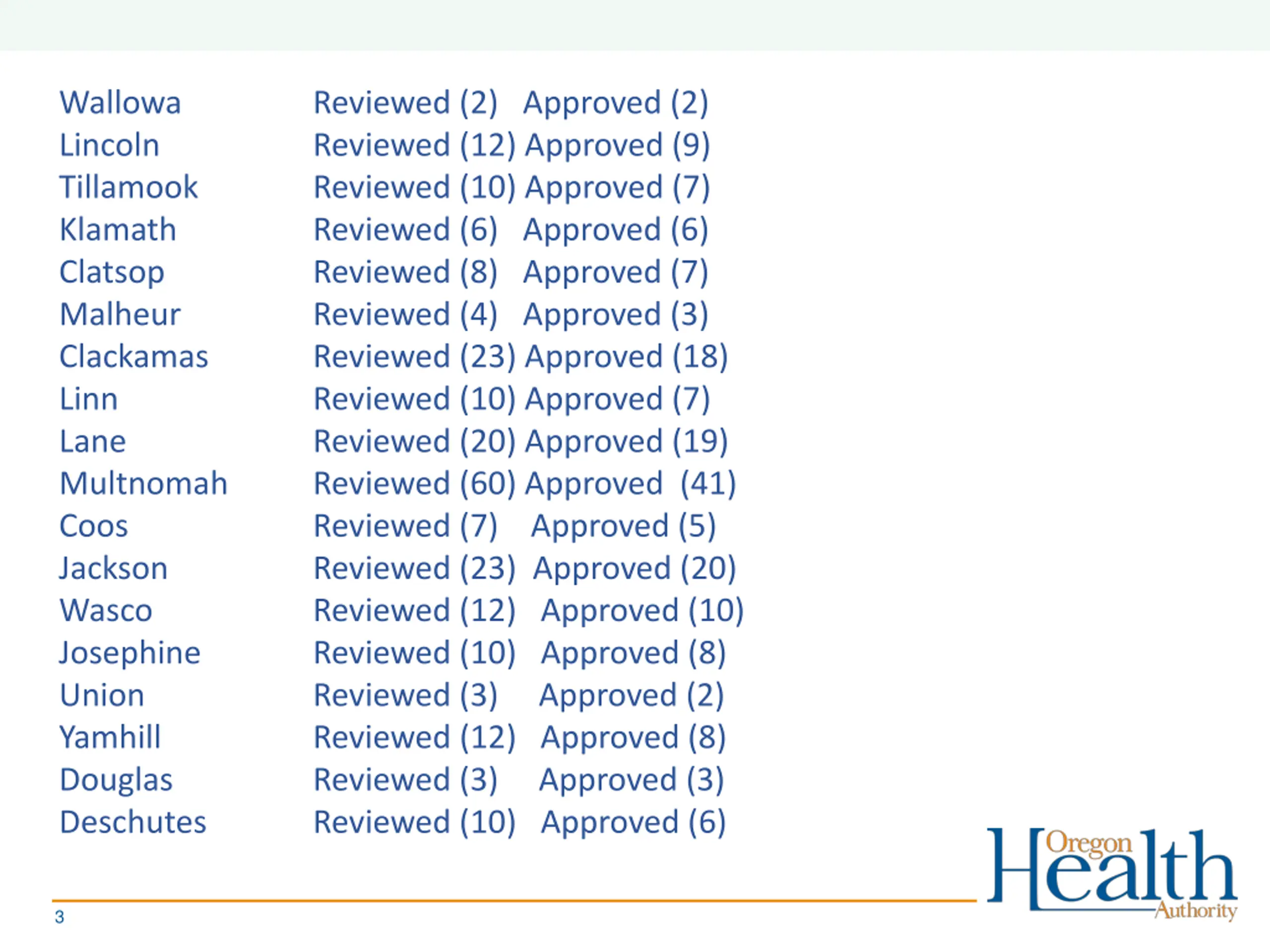 Wallowa Lincoln Tillamook Klamath Clatsop Malheur Clackamas Linn Lane Multnomah Coos Jackson Wasco Josephine Union Yamhill Douglas Deschutes Reviewed (2) Approved (2) Reviewed (12) Approved (9) Reviewed (10) Approved (7) Reviewed (6) Approved (6) Reviewed (8) Approved (7) Reviewed (4) Approved (3) Reviewed (23) Approved (18) Reviewed (10) Approved (7) Reviewed (20) Approved (19) Reviewed (60) Approved (41) Reviewed (7) Approved (5) Reviewed (23) Approved (20) Reviewed (12) Approved (10) Reviewed (10) Approved (8) Reviewed (3) Approved (2) Reviewed (12) Approved (8) Reviewed (3) Approved (3) Reviewed (10) Approved (6) 3
