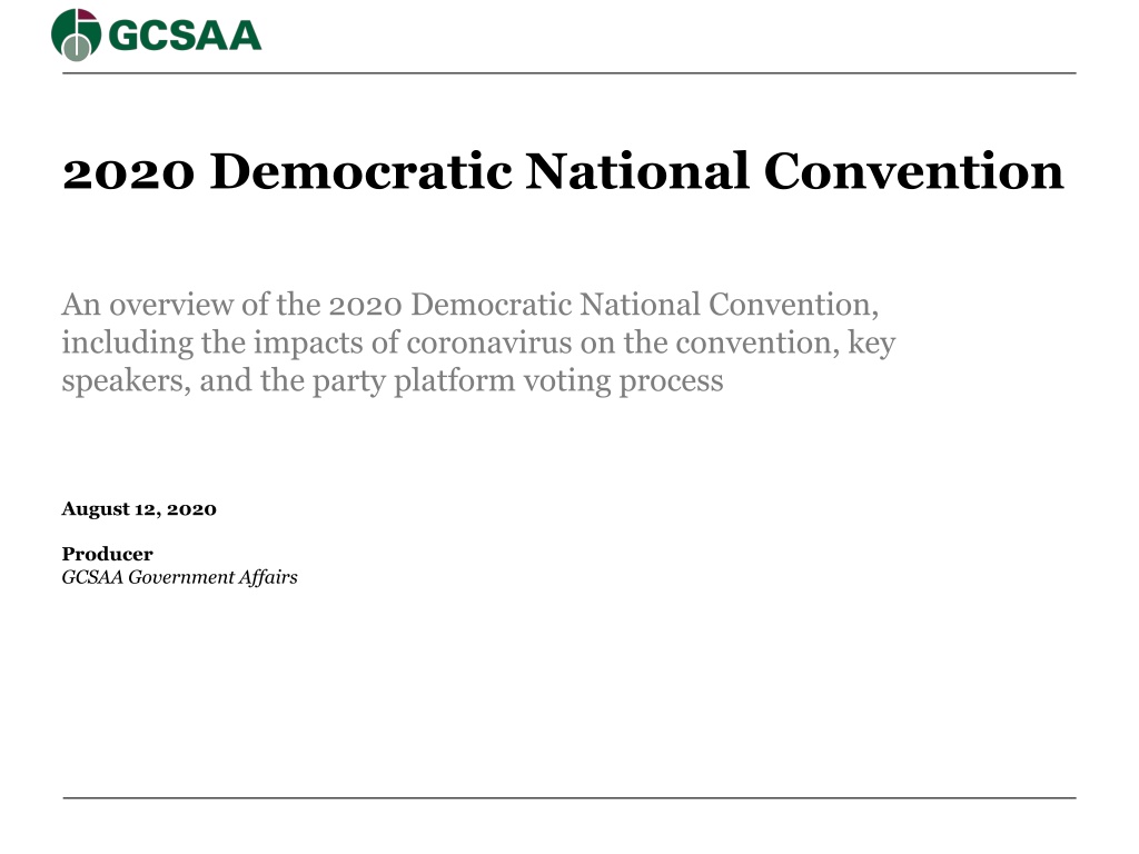 2020 Democratic National Convention An overview of the 2020 Democratic National Convention, including the impacts of coronavirus on the convention, key speakers, and the party platform voting process August 12, 2020 Producer GCSAA Government Affairs