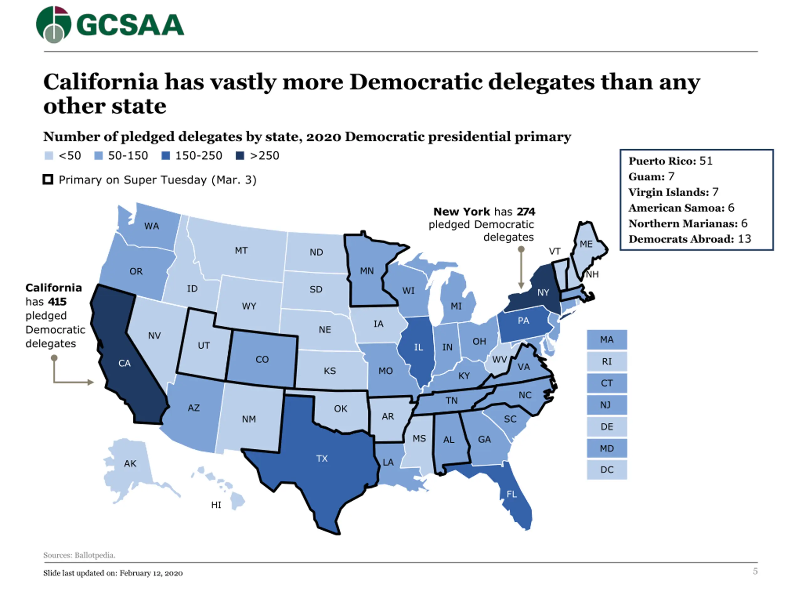 California has vastly more Democratic delegates than any other state Number of pledged delegates by state, 2020 Democratic presidential primary <50 50-150 150-250 >250 Puerto Rico: 51 Guam: 7 Virgin Islands: 7 American Samoa: 6 Northern Marianas: 6 Democrats Abroad: 13 Primary on Super Tuesday (Mar. 3) New York has 274 pledged Democratic delegates WA ME MT VT ND MN OR NH California has 415 pledged Democratic delegates ID SD WI NY WY MI PA IA NE NV MA OH UT IL IN WV CO RI CA VA KS MO KY CT NC TN NJ AZ OK AR SC NM DE MS GA AL MD TX LA AK DC FL HI Sources: Ballotpedia. 5 Slide last updated on: February 12, 2020