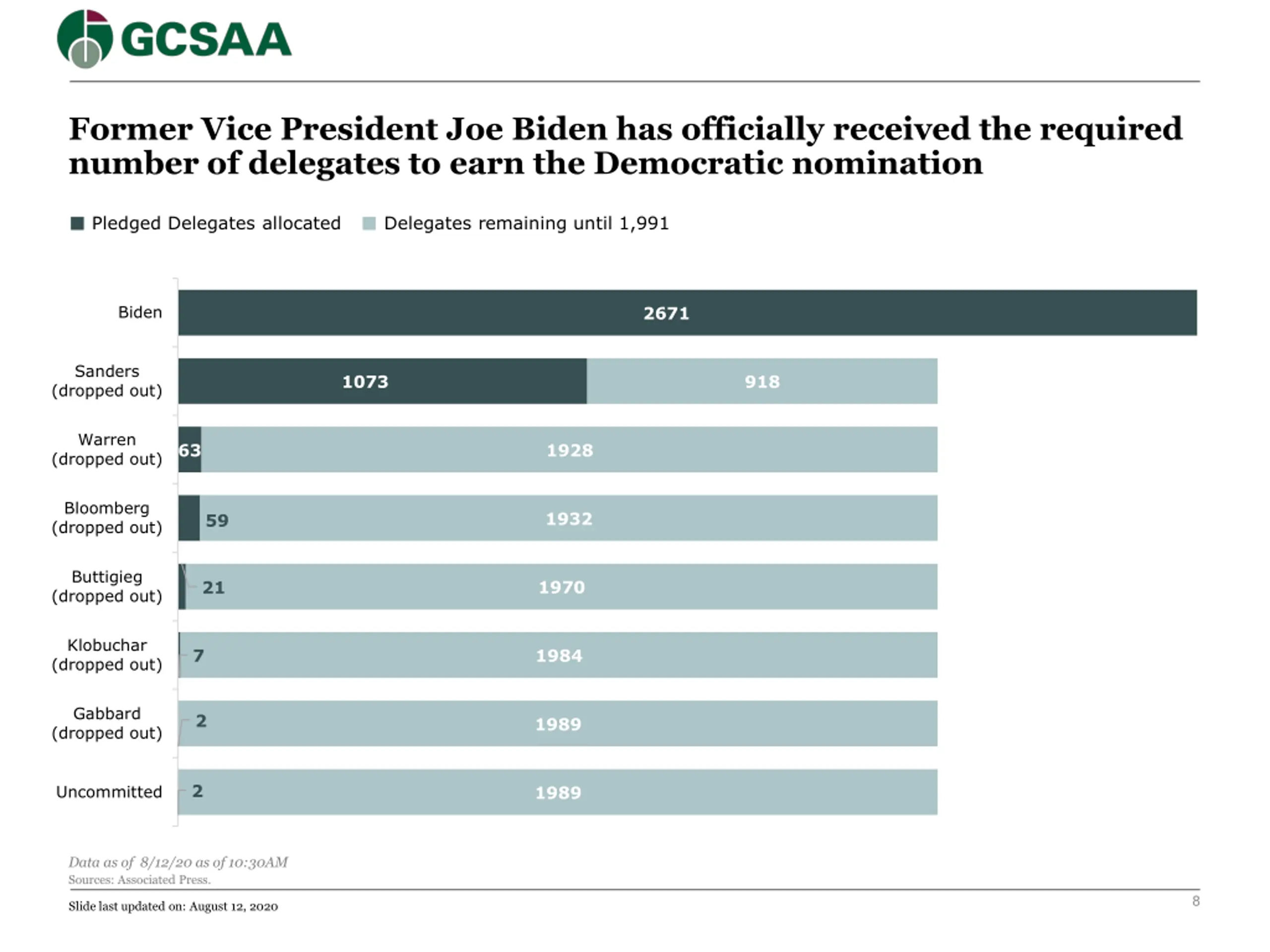 Former Vice President Joe Biden has officially received the required number of delegates to earn the Democratic nomination Pledged Delegates allocated Delegates remaining until 1,991 Biden 2671 Sanders (dropped out) 1073 918 Warren (dropped out) 63 1928 Bloomberg (dropped out) 1932 59 Buttigieg (dropped out) 1970 21 Klobuchar (dropped out) 7 1984 Gabbard (dropped out) 2 1989 2 Uncommitted 1989 Data as of 8/12/20 as of 10:30AM Sources: Associated Press. 8 Slide last updated on: August 12, 2020
