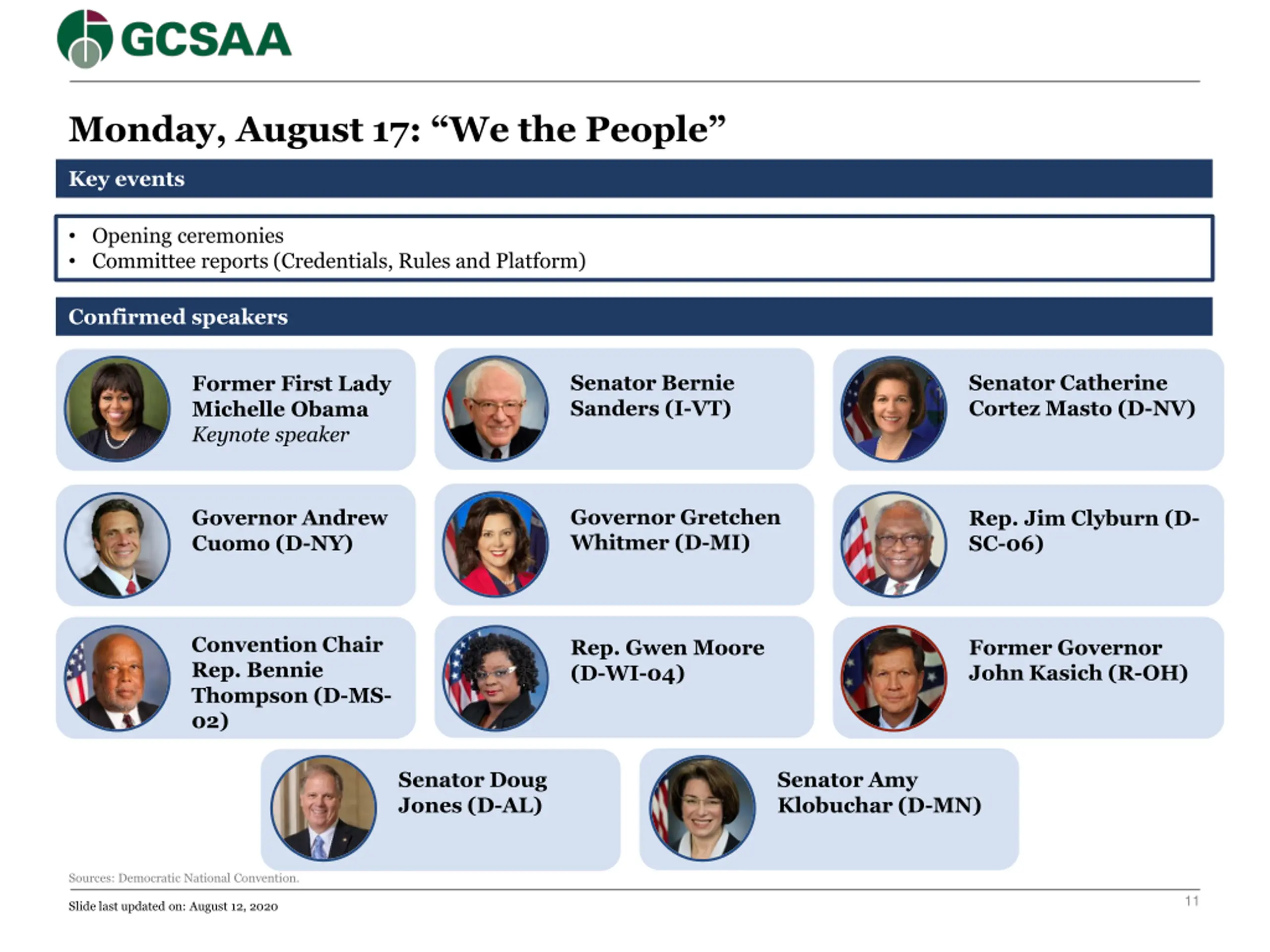 Monday, August 17: We the People Key events Opening ceremonies Committee reports (Credentials, Rules and Platform) Confirmed speakers Senator Bernie Sanders (I-VT) Senator Catherine Cortez Masto (D-NV) Former First Lady Michelle Obama Keynote speaker Governor Gretchen Whitmer (D-MI) Governor Andrew Cuomo (D-NY) Rep. Jim Clyburn (D- SC-06) Convention Chair Rep. Bennie Thompson (D-MS- 02) Former Governor John Kasich (R-OH) Rep. Gwen Moore (D-WI-04) Senator Doug Jones (D-AL) Senator Amy Klobuchar (D-MN) Sources: Democratic National Convention. 11 Slide last updated on: August 12, 2020