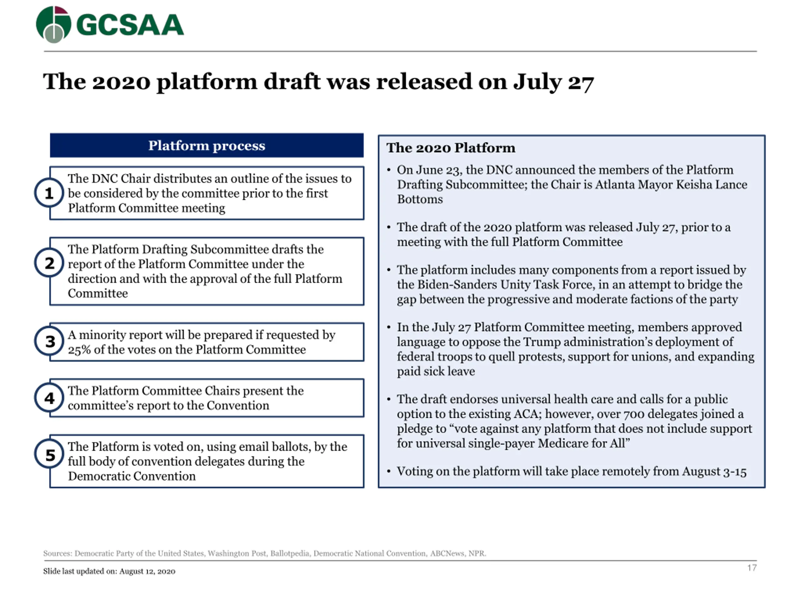 The 2020 platform draft was released on July 27 Platform process The 2020 Platform On June 23, the DNC announced the members of the Platform Drafting Subcommittee; the Chair is Atlanta Mayor Keisha Lance Bottoms The DNC Chair distributes an outline of the issues to be considered by the committee prior to the first Platform Committee meeting 1 The draft of the 2020 platform was released July 27, prior to a meeting with the full Platform Committee The Platform Drafting Subcommittee drafts the report of the Platform Committee under the direction and with the approval of the full Platform Committee 2 The platform includes many components from a report issued by the Biden-Sanders Unity Task Force, in an attempt to bridge the gap between the progressive and moderate factions of the party In the July 27 Platform Committee meeting, members approved language to oppose the Trump administration s deployment of federal troops to quell protests, support for unions, and expanding paid sick leave A minority report will be prepared if requested by 25% of the votes on the Platform Committee 3 The Platform Committee Chairs present the committee s report to the Convention 4 The draft endorses universal health care and calls for a public option to the existing ACA; however, over 700 delegates joined a pledge to vote against any platform that does not include support for universal single-payer Medicare for All The Platform is voted on, using email ballots, by the full body of convention delegates during the Democratic Convention 5 Voting on the platform will take place remotely from August 3-15 Sources: Democratic Party of the United States, Washington Post, Ballotpedia, Democratic National Convention, ABCNews, NPR. 17 Slide last updated on: August 12, 2020