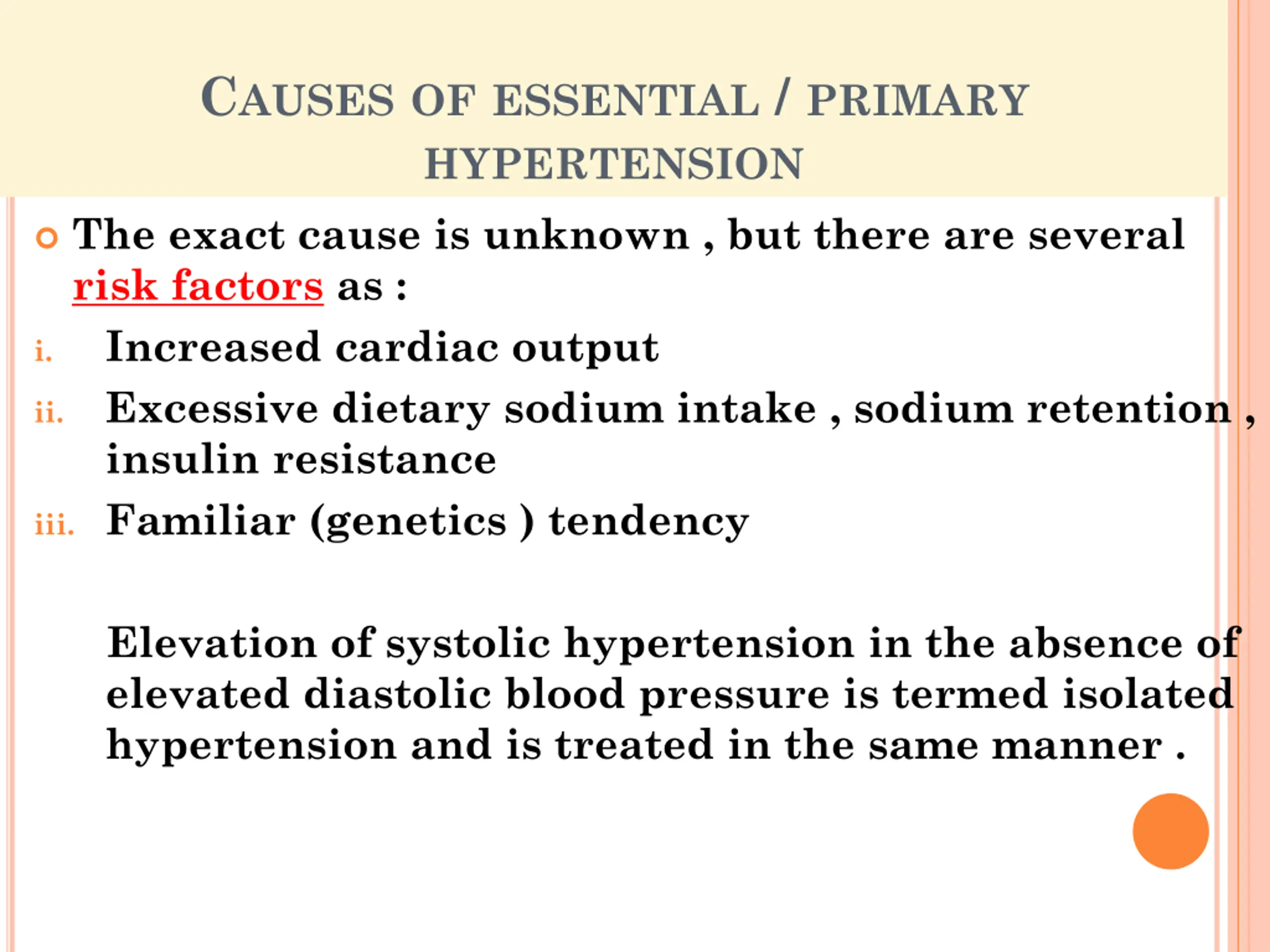 CAUSES OF ESSENTIAL / PRIMARY HYPERTENSION The exact cause is unknown , but there are several risk factors as : Increased cardiac output Excessive dietary sodium intake , sodium retention , insulin resistance iii. Familiar (genetics ) tendency i. ii. Elevation of systolic hypertension in the absence of elevated diastolic blood pressure is termed isolated hypertension and is treated in the same manner .