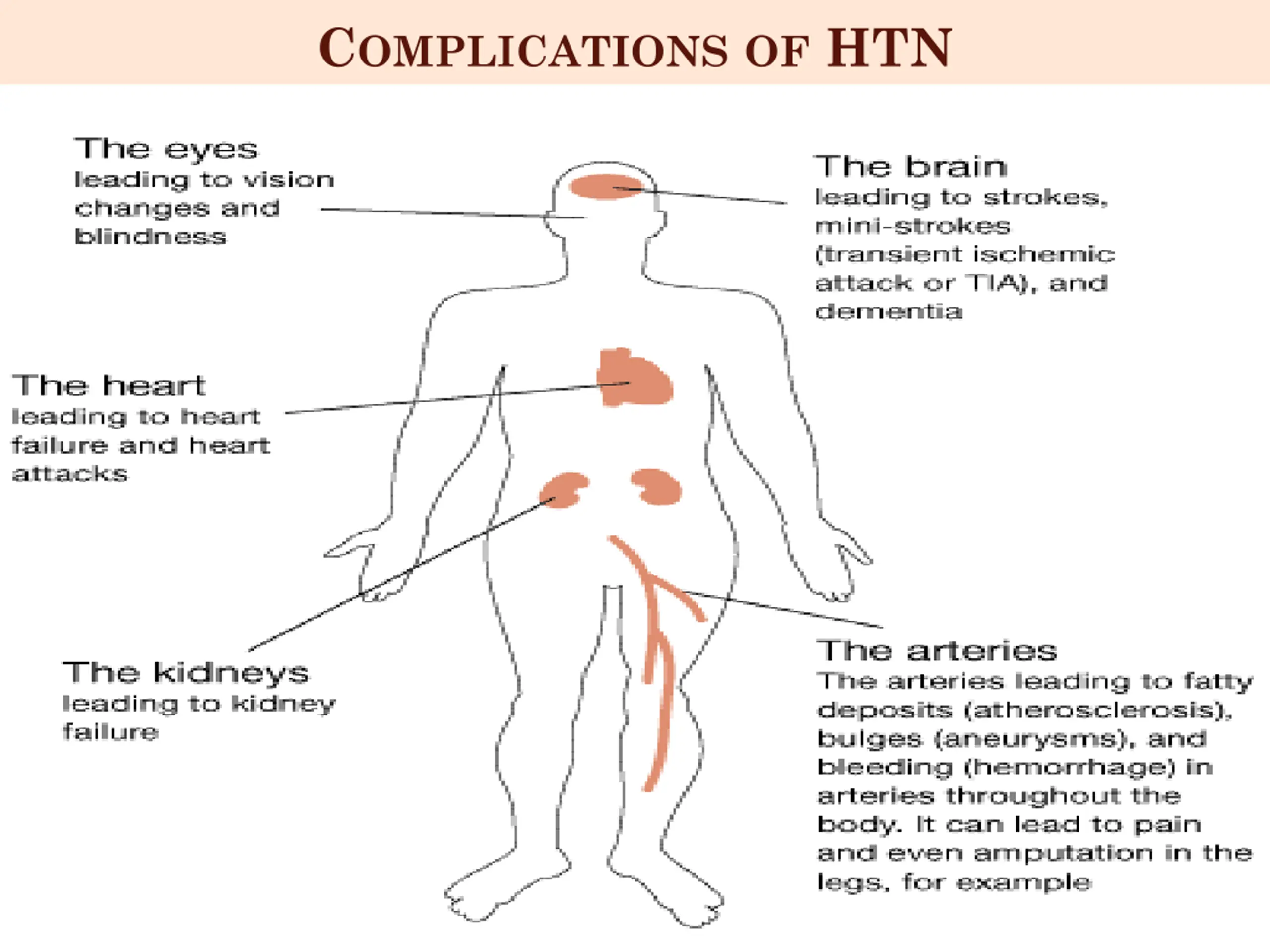 NURSING INTERVENTIONS Explain the meaning of high BP risk factors , effect on CVS , renal ,cerebral Stress that there can never be total cure , only control of the disease will achieved Stress that there is no relation between the symptoms and the disease