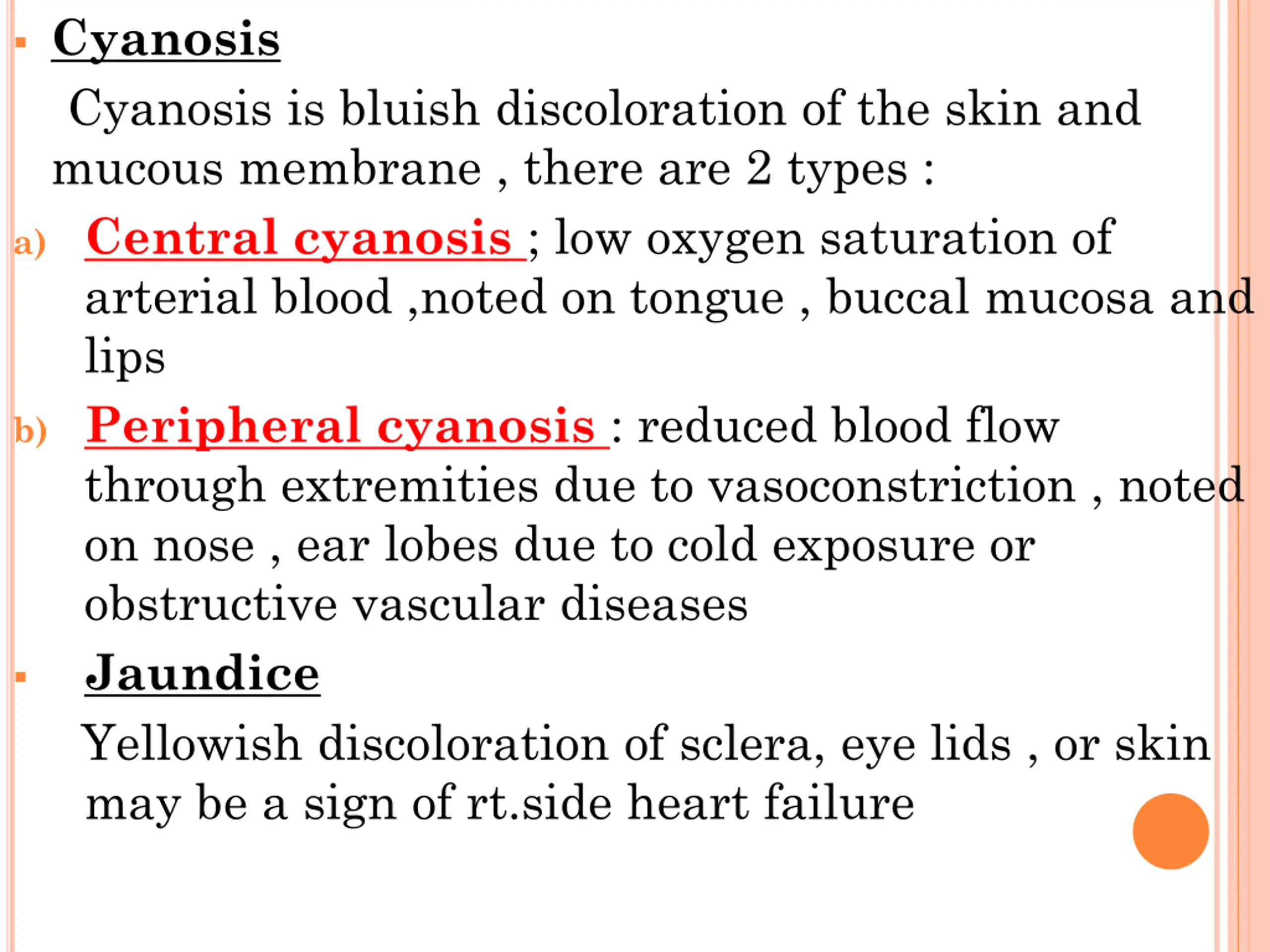 Cyanosis Cyanosis is bluish discoloration of the skin and mucous membrane , there are 2 types : a) Central cyanosis ; low oxygen saturation of arterial blood ,noted on tongue , buccal mucosa and lips b) Peripheral cyanosis : reduced blood flow through extremities due to vasoconstriction , noted on nose , ear lobes due to cold exposure or obstructive vascular diseases Jaundice Yellowish discoloration of sclera, eye lids , or skin may be a sign of rt.side heart failure