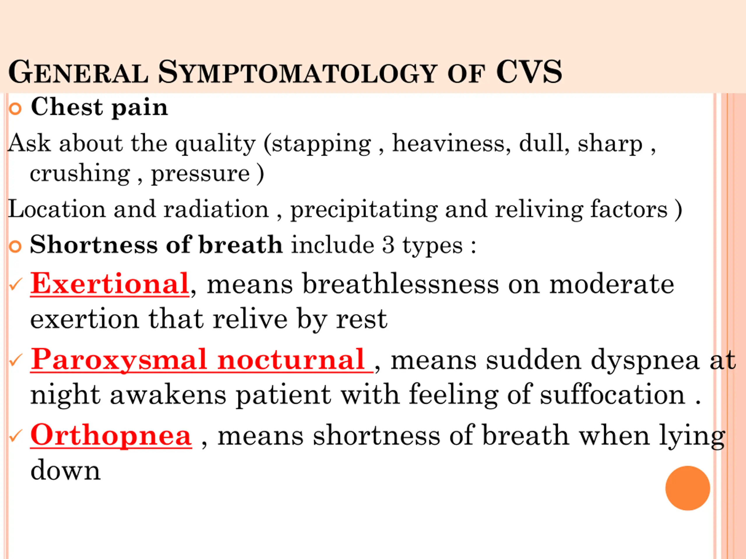 GENERAL SYMPTOMATOLOGY OF CVS Chest pain Ask about the quality (stapping , heaviness, dull, sharp , crushing , pressure ) Location and radiation , precipitating and reliving factors ) Shortness of breath include 3 types : Exertional, means breathlessness on moderate exertion that relive by rest Paroxysmal nocturnal , means sudden dyspnea at night awakens patient with feeling of suffocation . Orthopnea , means shortness of breath when lying down