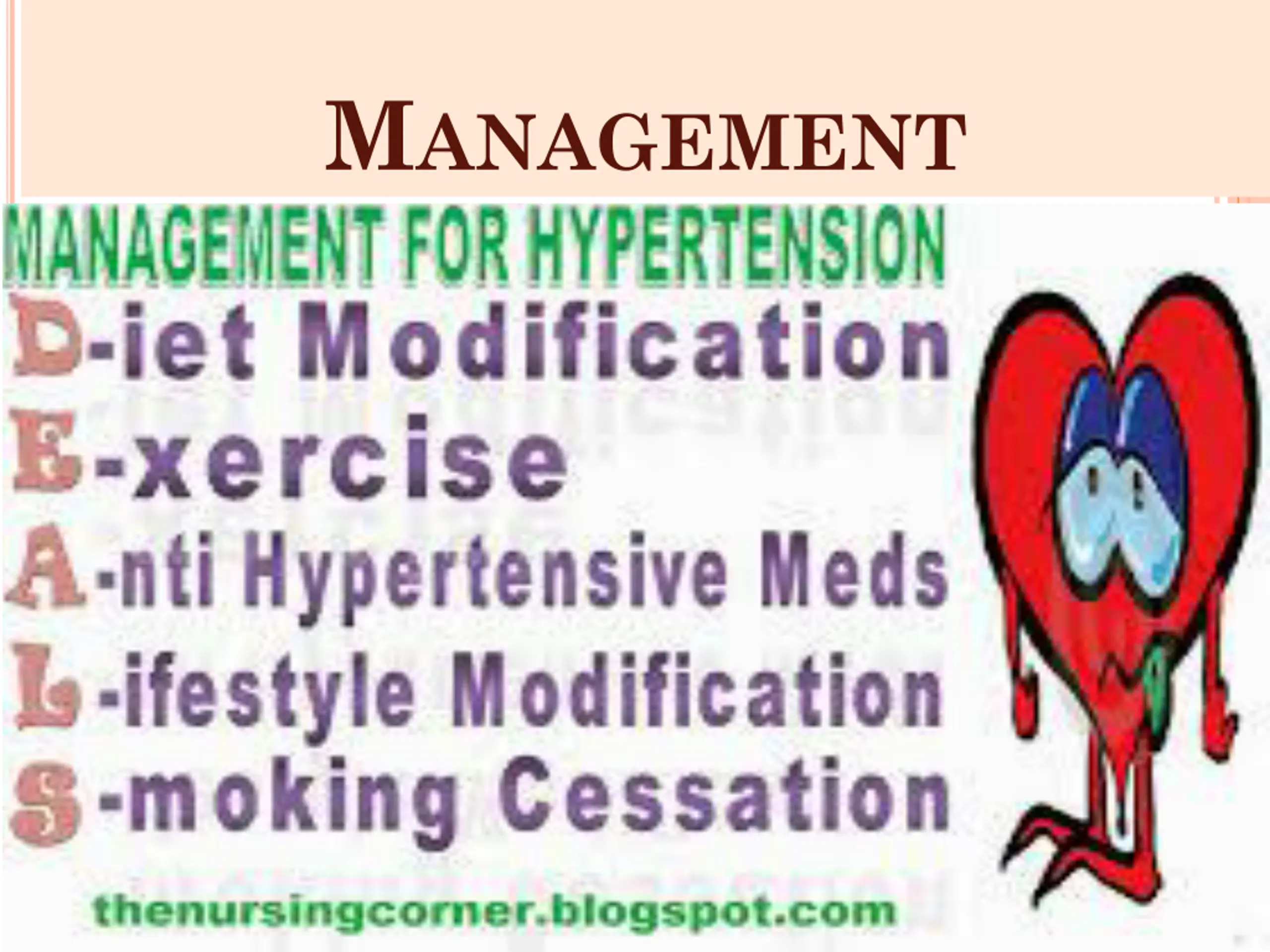 MANAGEMENT LIFE STYLE MODIFICATIONS Lose weight if body mass index is greater than or equal 27 Limit alcohol Get regular aerobic exercise equivalent to 30 to 45 min of walking most days Cut sodium intake to 2.4g or less /day Include daily allowance of potassium , calcium and magnesium in diet Stop smoking Reduced dietary saturated fat and cholesterol Consider reducing coffee intake (5 cups /day increased the BP) If despite modification of life style , the BP remains high over 3-6 months , drug therapy should be initiated .