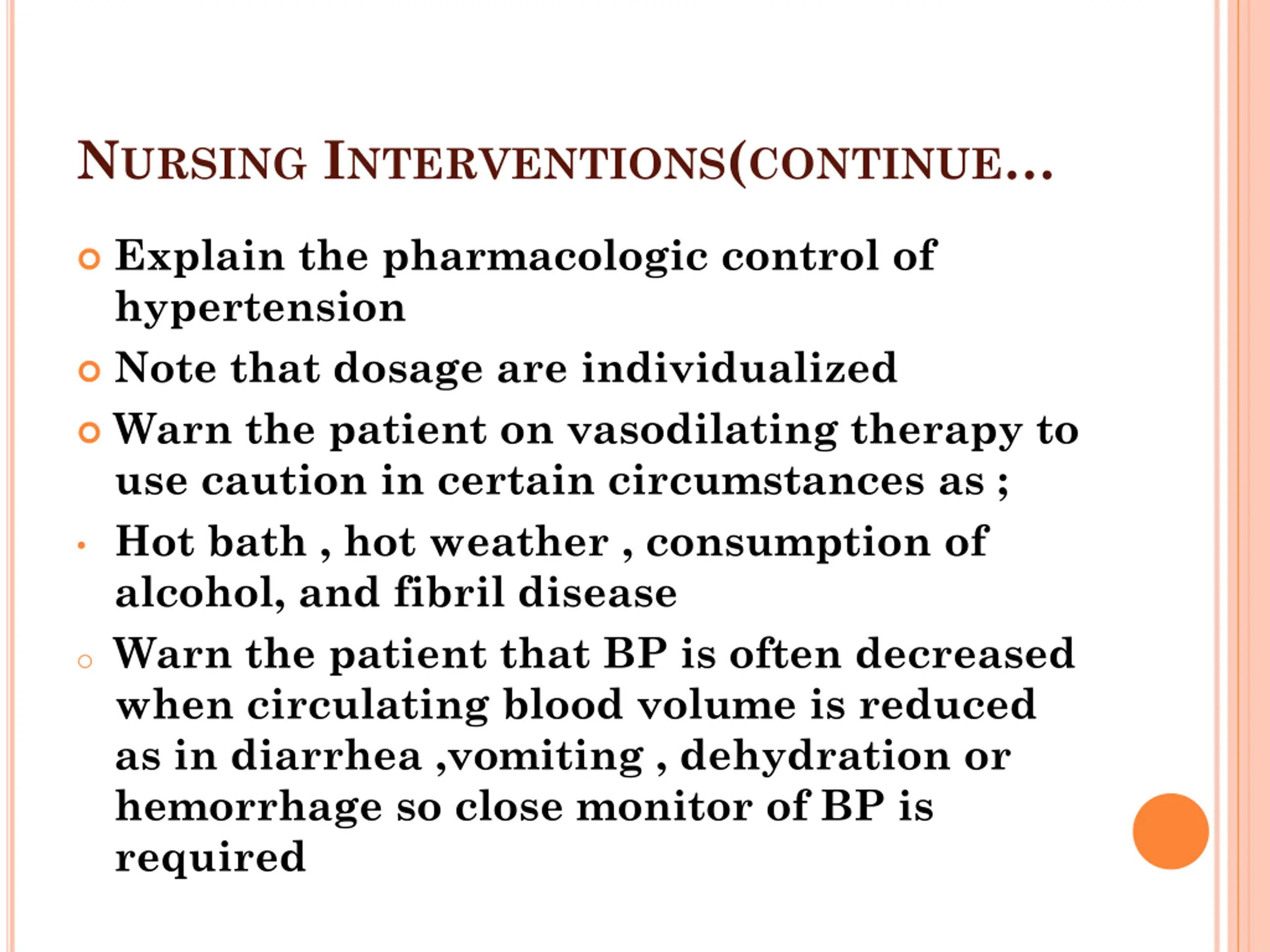 NURSING INTERVENTIONS(CONTINUE Explain the pharmacologic control of hypertension Note that dosage are individualized Warn the patient on vasodilating therapy to use caution in certain circumstances as ; Hot bath , hot weather , consumption of alcohol, and fibril disease o Warn the patient that BP is often decreased when circulating blood volume is reduced as in diarrhea ,vomiting , dehydration or hemorrhage so close monitor of BP is required