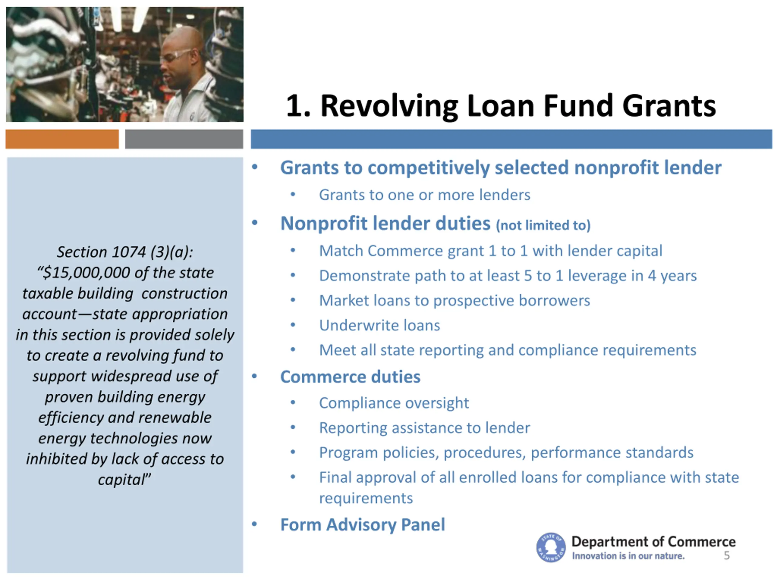 1. Revolving Loan Fund Grants Grants to competitively selected nonprofit lender Grants to one or more lenders Nonprofit lender duties (not limited to) Match Commerce grant 1 to 1 with lender capital Demonstrate path to at least 5 to 1 leverage in 4 years Market loans to prospective borrowers Underwrite loans Meet all state reporting and compliance requirements Commerce duties Compliance oversight Reporting assistance to lender Program policies, procedures, performance standards Final approval of all enrolled loans for compliance with state requirements Form Advisory Panel Section 1074 (3)(a): $15,000,000 of the state taxable building construction account state appropriation in this section is provided solely to create a revolving fund to support widespread use of proven building energy efficiency and renewable energy technologies now inhibited by lack of access to capital 5