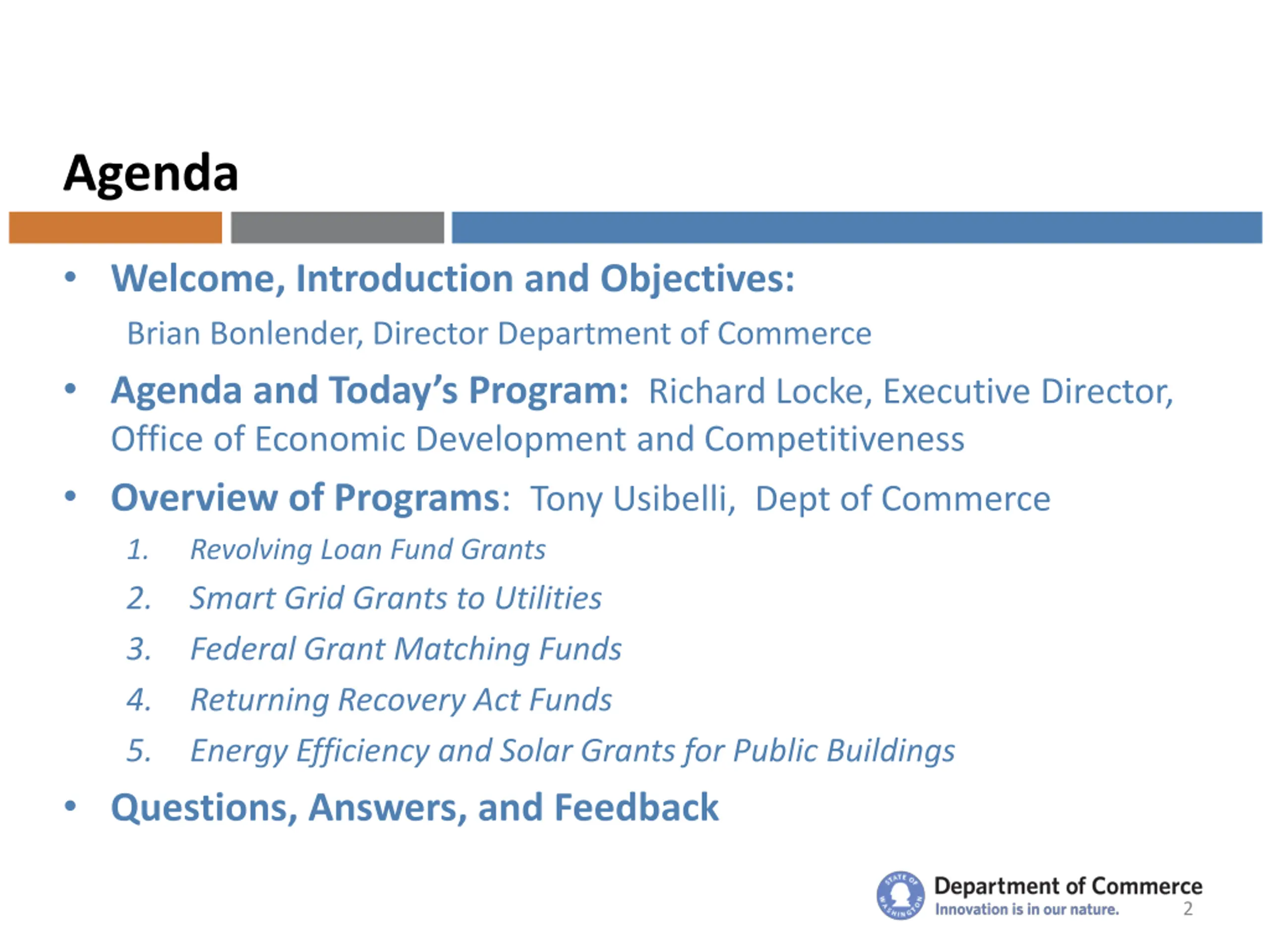 Agenda Welcome, Introduction and Objectives: Brian Bonlender, Director Department of Commerce Agenda and Today s Program: Richard Locke, Executive Director, Office of Economic Development and Competitiveness Overview of Programs: Tony Usibelli, Dept of Commerce 1. Revolving Loan Fund Grants 2. Smart Grid Grants to Utilities 3. Federal Grant Matching Funds 4. Returning Recovery Act Funds 5. Energy Efficiency and Solar Grants for Public Buildings Questions, Answers, and Feedback 2