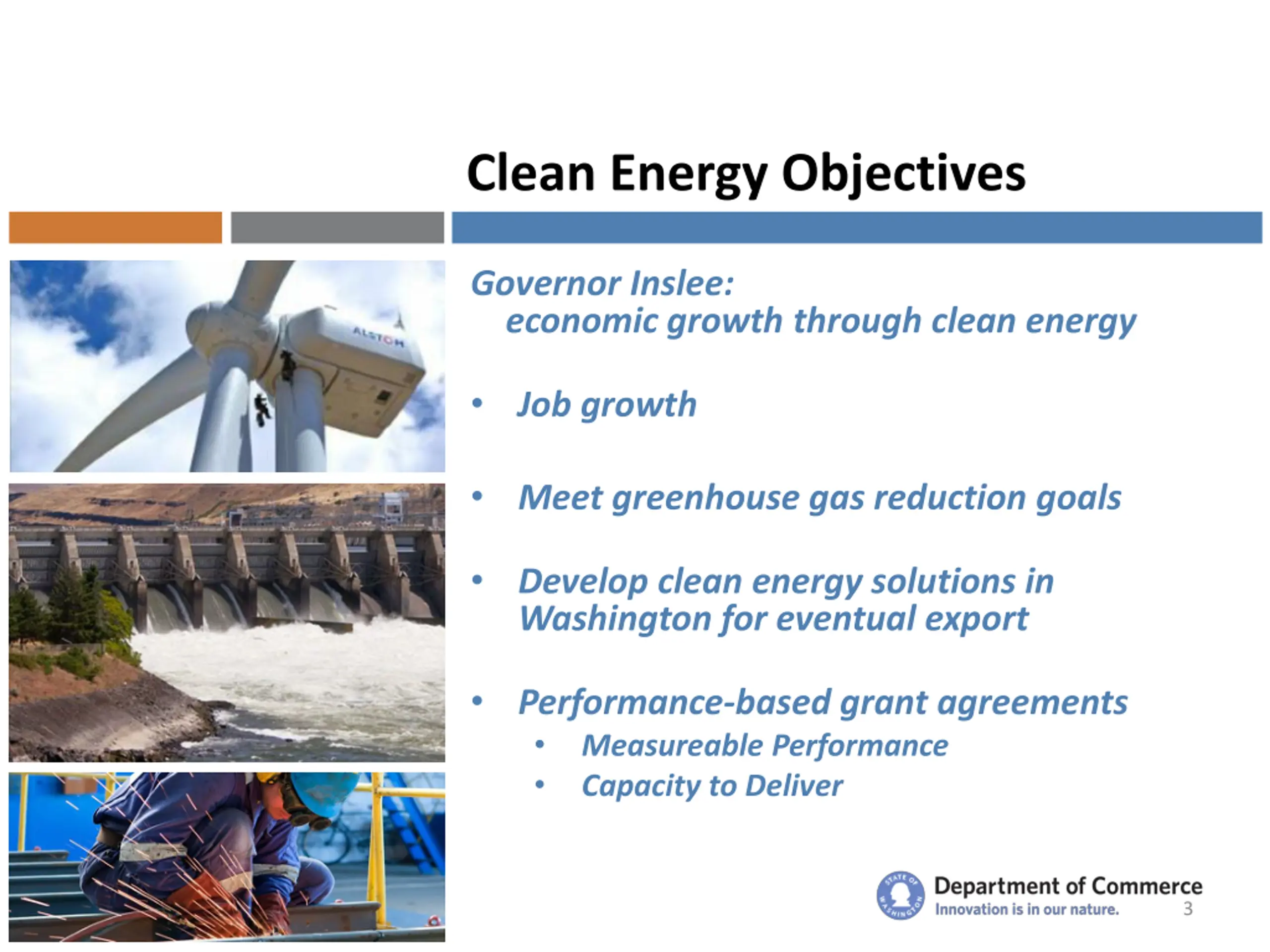 Clean Energy Objectives Governor Inslee: economic growth through clean energy Job growth Meet greenhouse gas reduction goals Develop clean energy solutions in Washington for eventual export Performance-based grant agreements Measureable Performance Capacity to Deliver 3