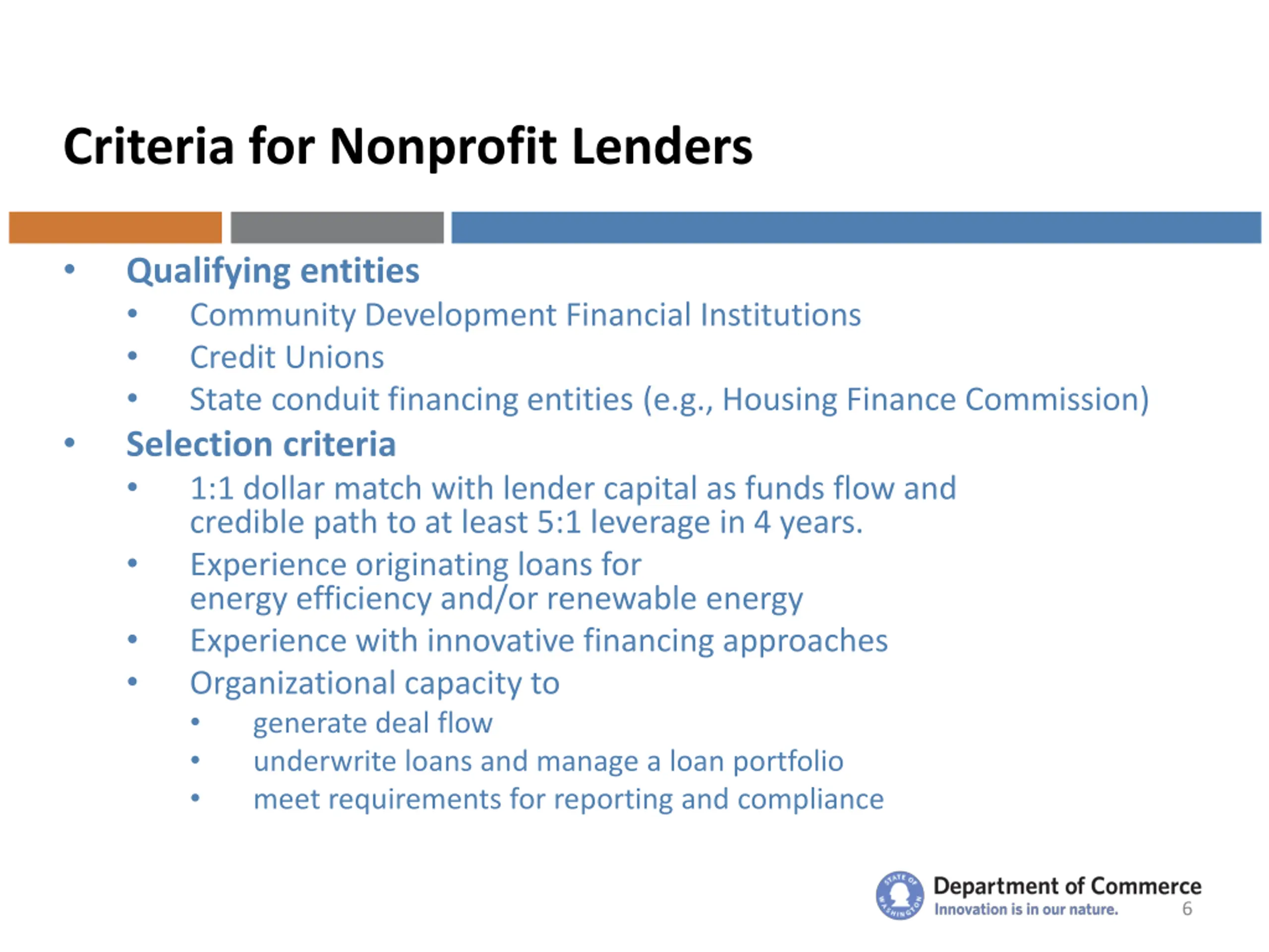Criteria for Nonprofit Lenders Qualifying entities Community Development Financial Institutions Credit Unions State conduit financing entities (e.g., Housing Finance Commission) Selection criteria 1:1 dollar match with lender capital as funds flow and credible path to at least 5:1 leverage in 4 years. Experience originating loans for energy efficiency and/or renewable energy Experience with innovative financing approaches Organizational capacity to generate deal flow underwrite loans and manage a loan portfolio meet requirements for reporting and compliance 6