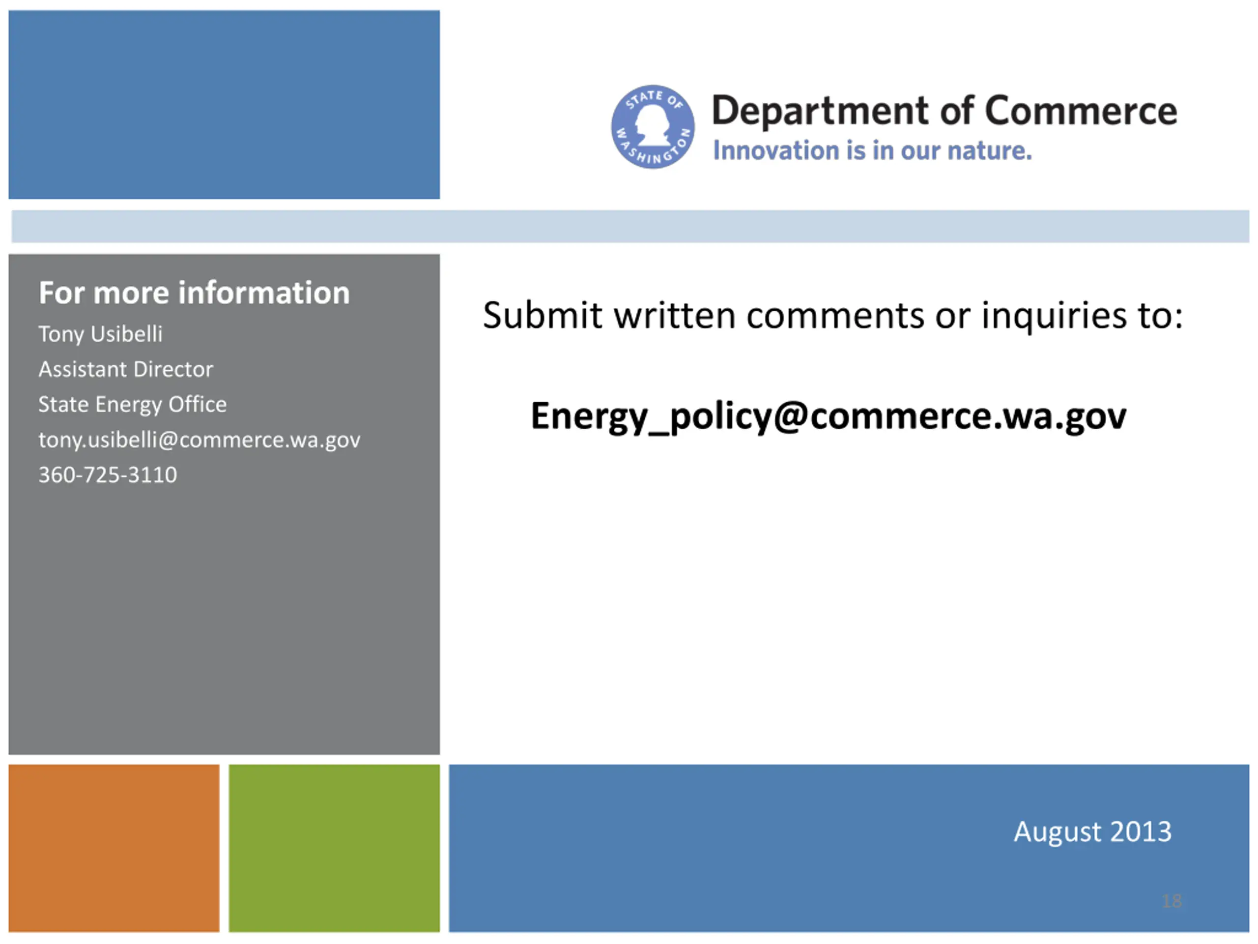 For more information Tony Usibelli Assistant Director State Energy Office tony.usibelli@commerce.wa.gov 360-725-3110 Submit written comments or inquiries to: Energy_policy@commerce.wa.gov August 2013 18