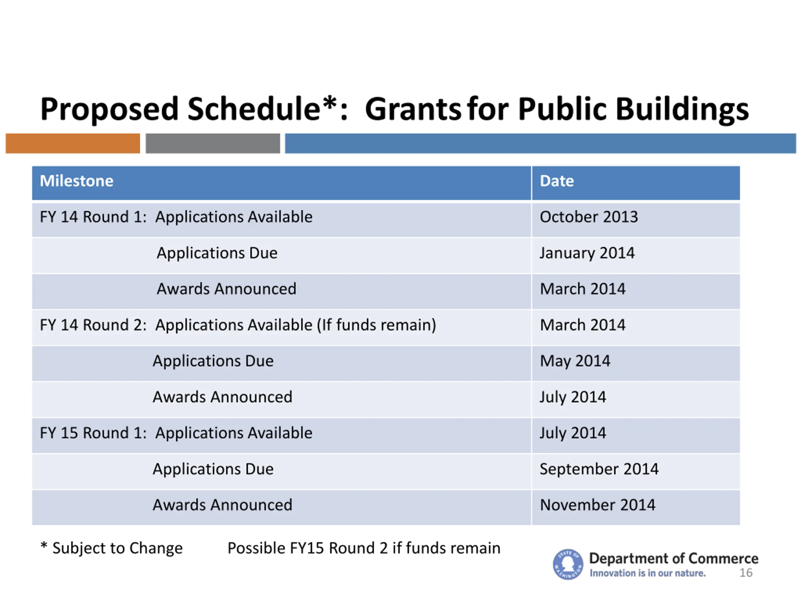 Proposed Schedule*: Grantsfor Public Buildings Milestone Date FY 14 Round 1: Applications Available October 2013 Applications Due January 2014 Awards Announced March 2014 FY 14 Round 2: Applications Available (If funds remain) March 2014 Applications Due May 2014 Awards Announced July 2014 FY 15 Round 1: Applications Available July 2014 Applications Due September 2014 Awards Announced November 2014 * Subject to Change Possible FY15 Round 2 if funds remain 16