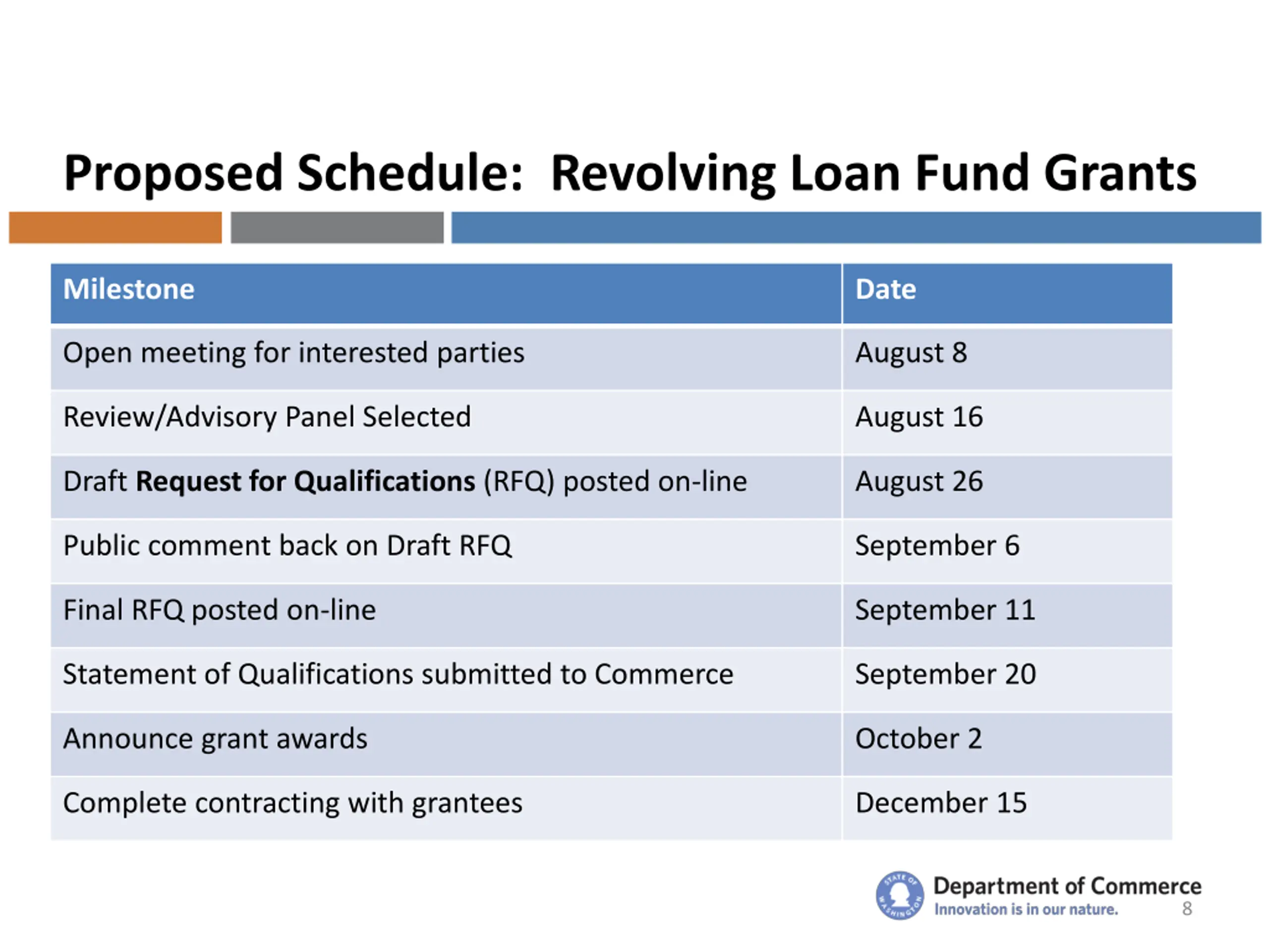 Proposed Schedule: Revolving Loan Fund Grants Milestone Date Open meeting for interested parties August 8 Review/Advisory Panel Selected August 16 Draft Request for Qualifications (RFQ) posted on-line August 26 Public comment back on Draft RFQ September 6 Final RFQ posted on-line September 11 Statement of Qualifications submitted to Commerce September 20 Announce grant awards October 2 Complete contracting with grantees December 15 8
