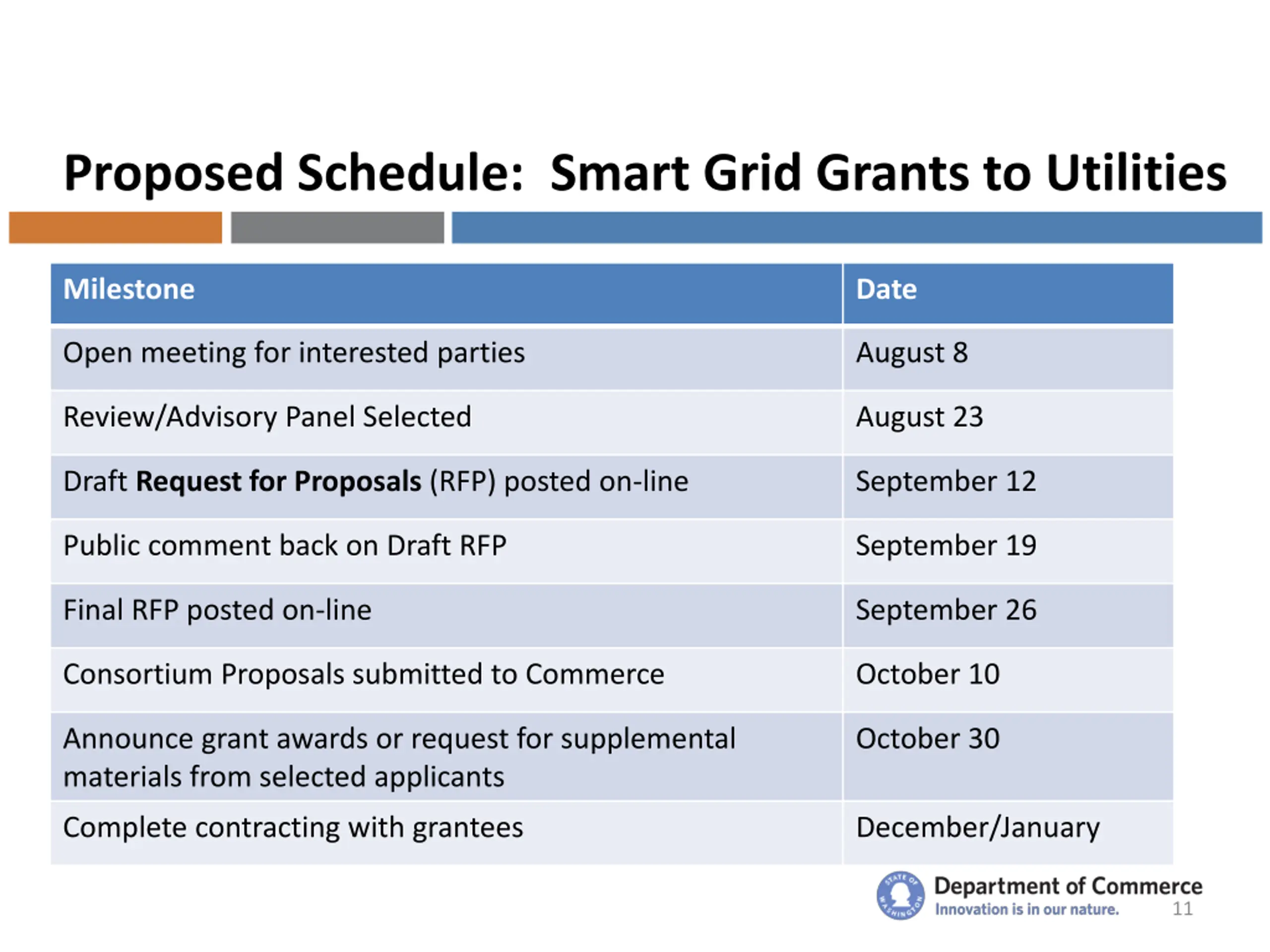 Proposed Schedule: Smart Grid Grants to Utilities Milestone Date Open meeting for interested parties August 8 Review/Advisory Panel Selected August 23 Draft Request for Proposals (RFP) posted on-line September 12 Public comment back on Draft RFP September 19 Final RFP posted on-line September 26 Consortium Proposals submitted to Commerce October 10 Announce grant awards or request for supplemental materials from selected applicants October 30 Complete contracting with grantees December/January 11