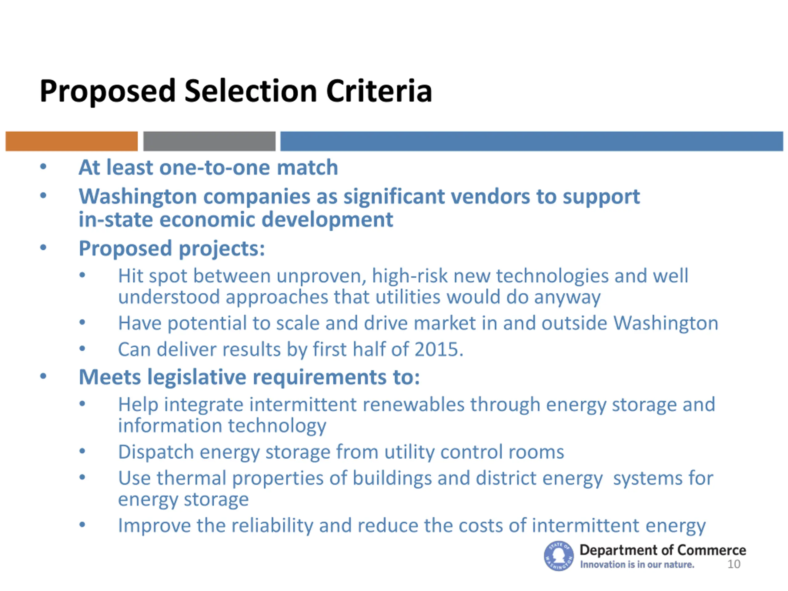 Proposed Selection Criteria At least one-to-one match Washington companies as significant vendors to support in-state economic development Proposed projects: Hit spot between unproven, high-risk new technologies and well understood approaches that utilities would do anyway Have potential to scale and drive market in and outside Washington Can deliver results by first half of 2015. Meets legislative requirements to: Help integrate intermittent renewables through energy storage and information technology Dispatch energy storage from utility control rooms Use thermal properties of buildings and district energy systems for energy storage Improve the reliability and reduce the costs of intermittent energy 10