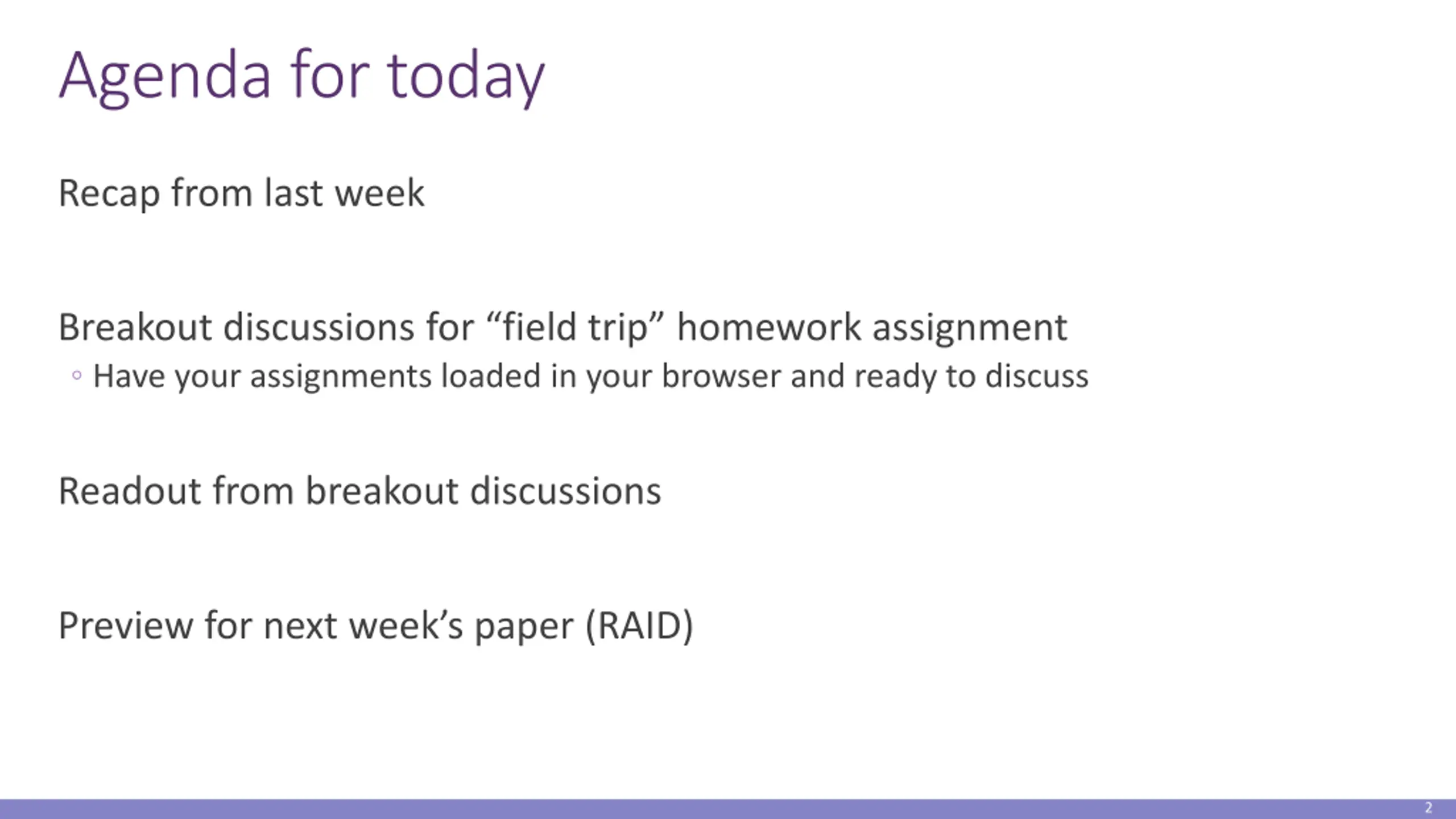 Agenda for today Recap from last week Breakout discussions for field trip homework assignment Have your assignments loaded in your browser and ready to discuss Readout from breakout discussions Preview for next week s paper (RAID) 2