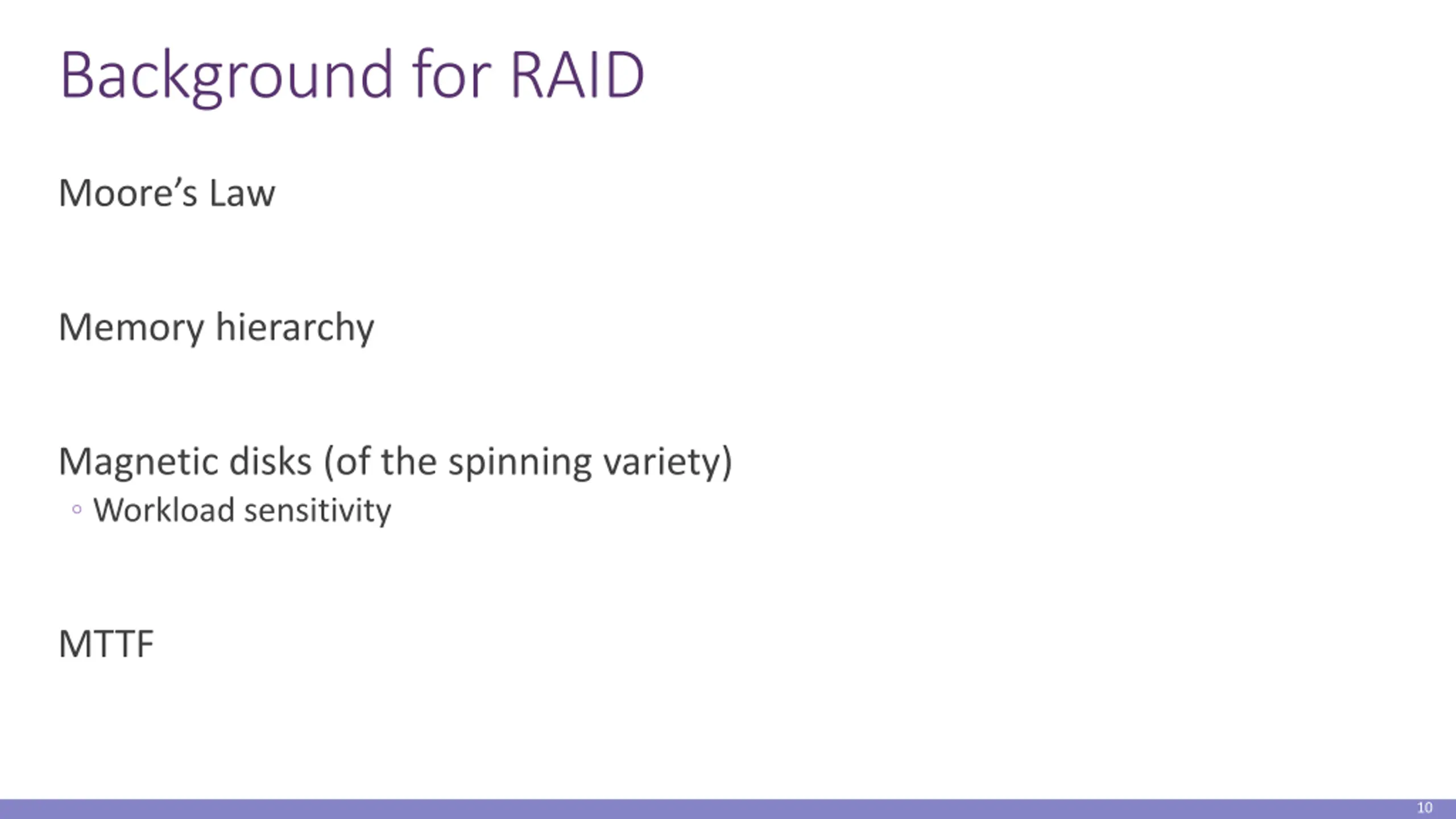 Background for RAID Moore s Law Memory hierarchy Magnetic disks (of the spinning variety) Workload sensitivity MTTF 10