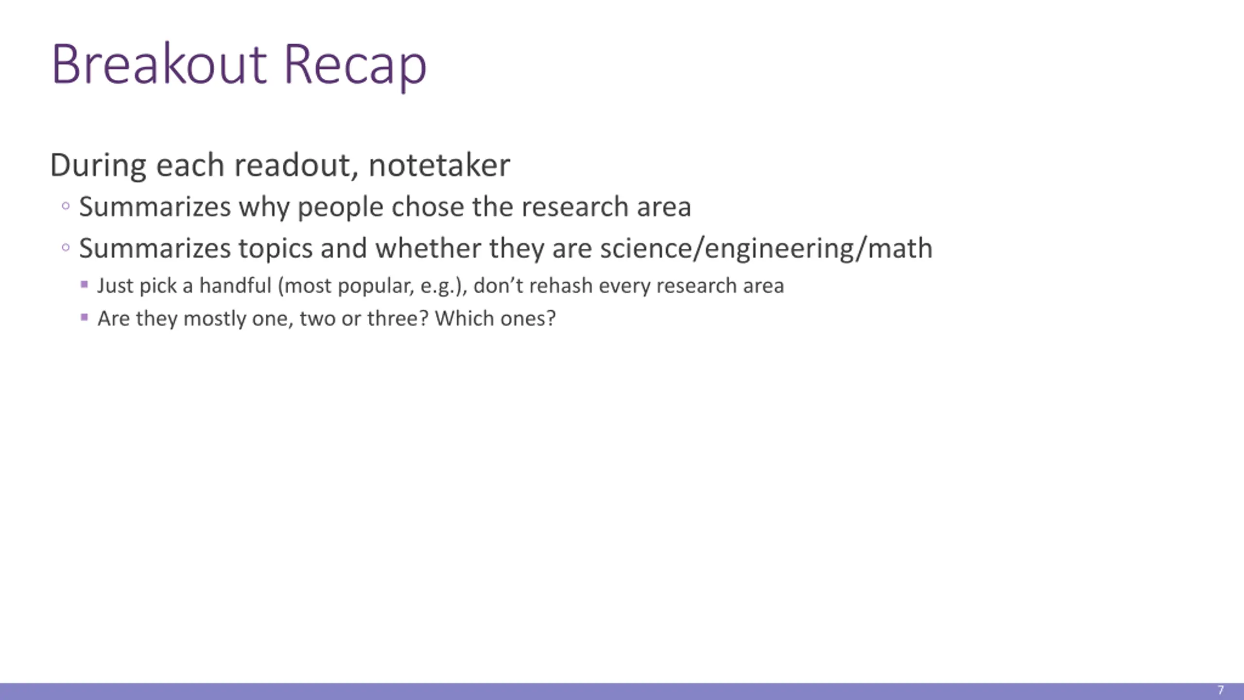 Breakout Recap During each readout, notetaker Summarizes why people chose the research area Summarizes topics and whether they are science/engineering/math Just pick a handful (most popular, e.g.), don t rehash every research area Are they mostly one, two or three? Which ones? 7