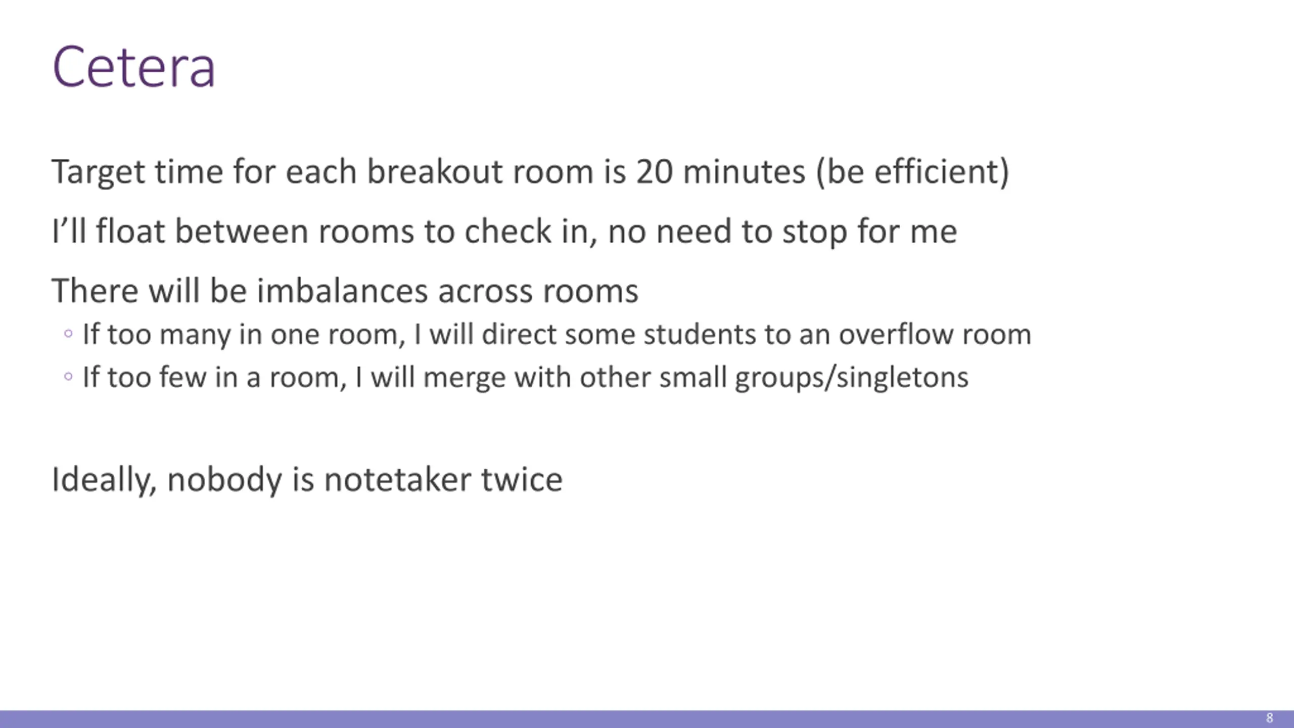 Cetera Target time for each breakout room is 20 minutes (be efficient) I ll float between rooms to check in, no need to stop for me There will be imbalances across rooms If too many in one room, I will direct some students to an overflow room If too few in a room, I will merge with other small groups/singletons Ideally, nobody is notetaker twice 8