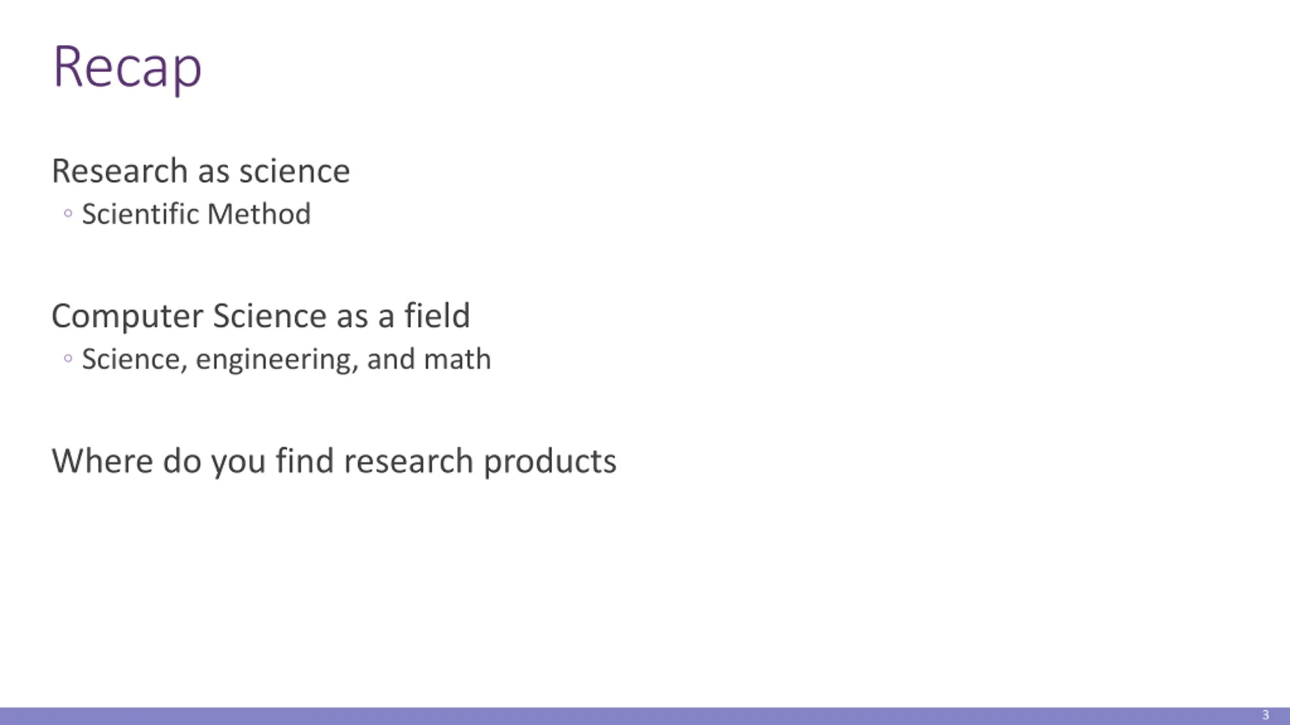 Recap Research as science Scientific Method Computer Science as a field Science, engineering, and math Where do you find research products 3