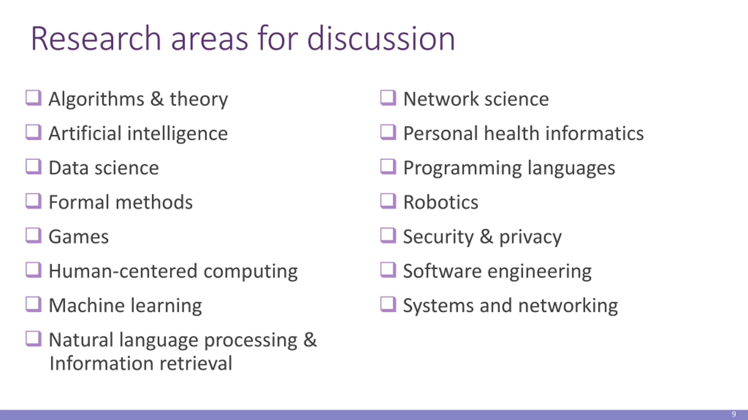 Research areas for discussion Algorithms & theory Artificial intelligence Data science Formal methods Games Human-centered computing Machine learning Natural language processing & Information retrieval Network science Personal health informatics Programming languages Robotics Security & privacy Software engineering Systems and networking 9