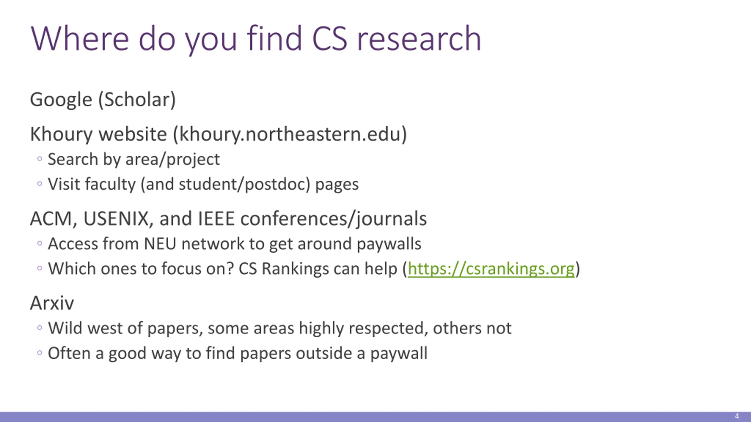 Where do you find CS research Google (Scholar) Khoury website (khoury.northeastern.edu) Search by area/project Visit faculty (and student/postdoc) pages ACM, USENIX, and IEEE conferences/journals Access from NEU network to get around paywalls Which ones to focus on? CS Rankings can help (https://csrankings.org) Arxiv Wild west of papers, some areas highly respected, others not Often a good way to find papers outside a paywall 4