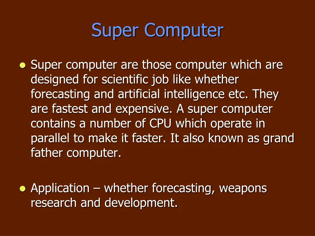 Super Computer Super computer are those computer which are designed for scientific job like whether forecasting and artificial intelligence etc. They are fastest and expensive. A super computer contains a number of CPU which operate in parallel to make it faster. It also known as grand father computer. Application whether forecasting, weapons research and development.