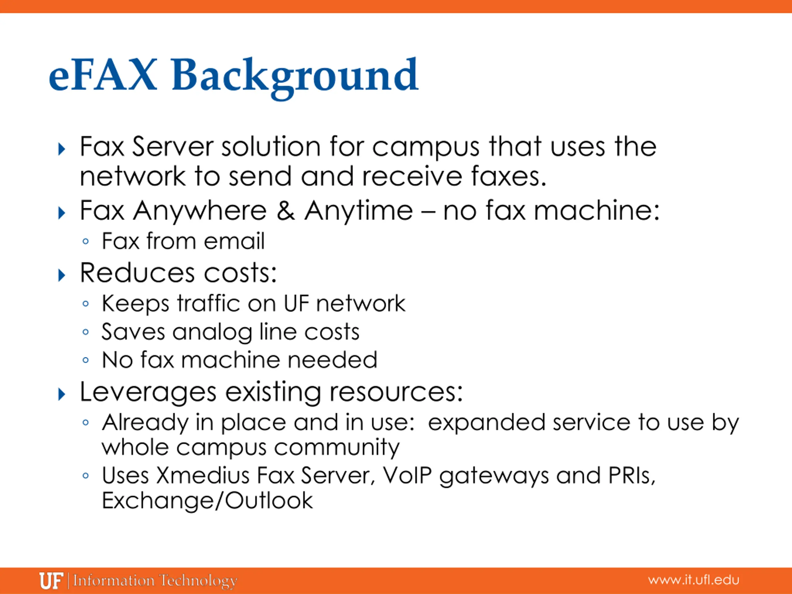 eFAX Background Fax Server solution for campus that uses the network to send and receive faxes. Fax Anywhere & Anytime no fax machine: Fax from email Reduces costs: Keeps traffic on UF network Saves analog line costs No fax machine needed Leverages existing resources: Already in place and in use: expanded service to use by whole campus community Uses Xmedius Fax Server, VoIP gateways and PRIs, Exchange/Outlook www.it.ufl.edu
