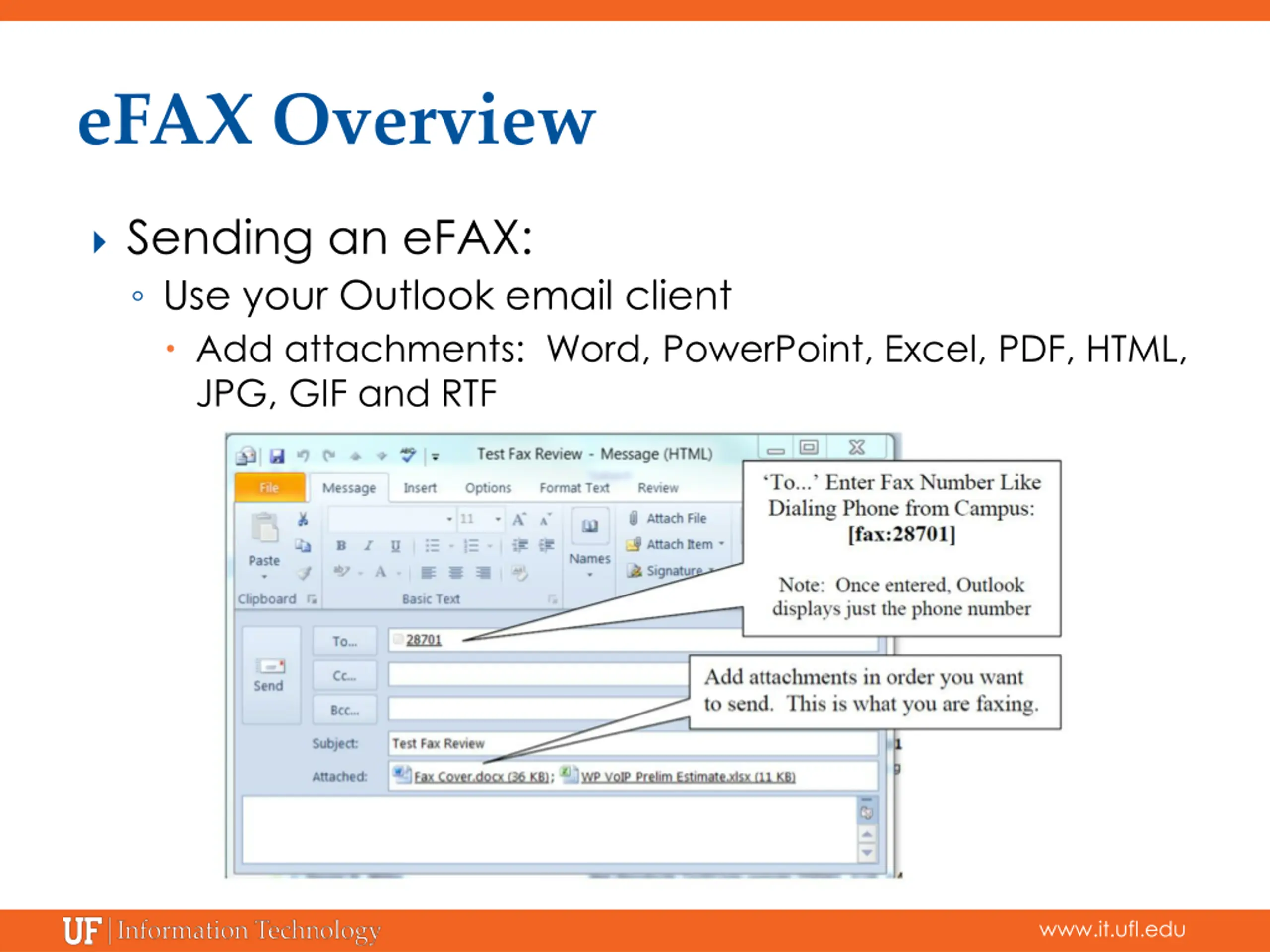 eFAX Overview Sending an eFAX: Use your Outlook email client Add attachments: Word, PowerPoint, Excel, PDF, HTML, JPG, GIF and RTF www.it.ufl.edu