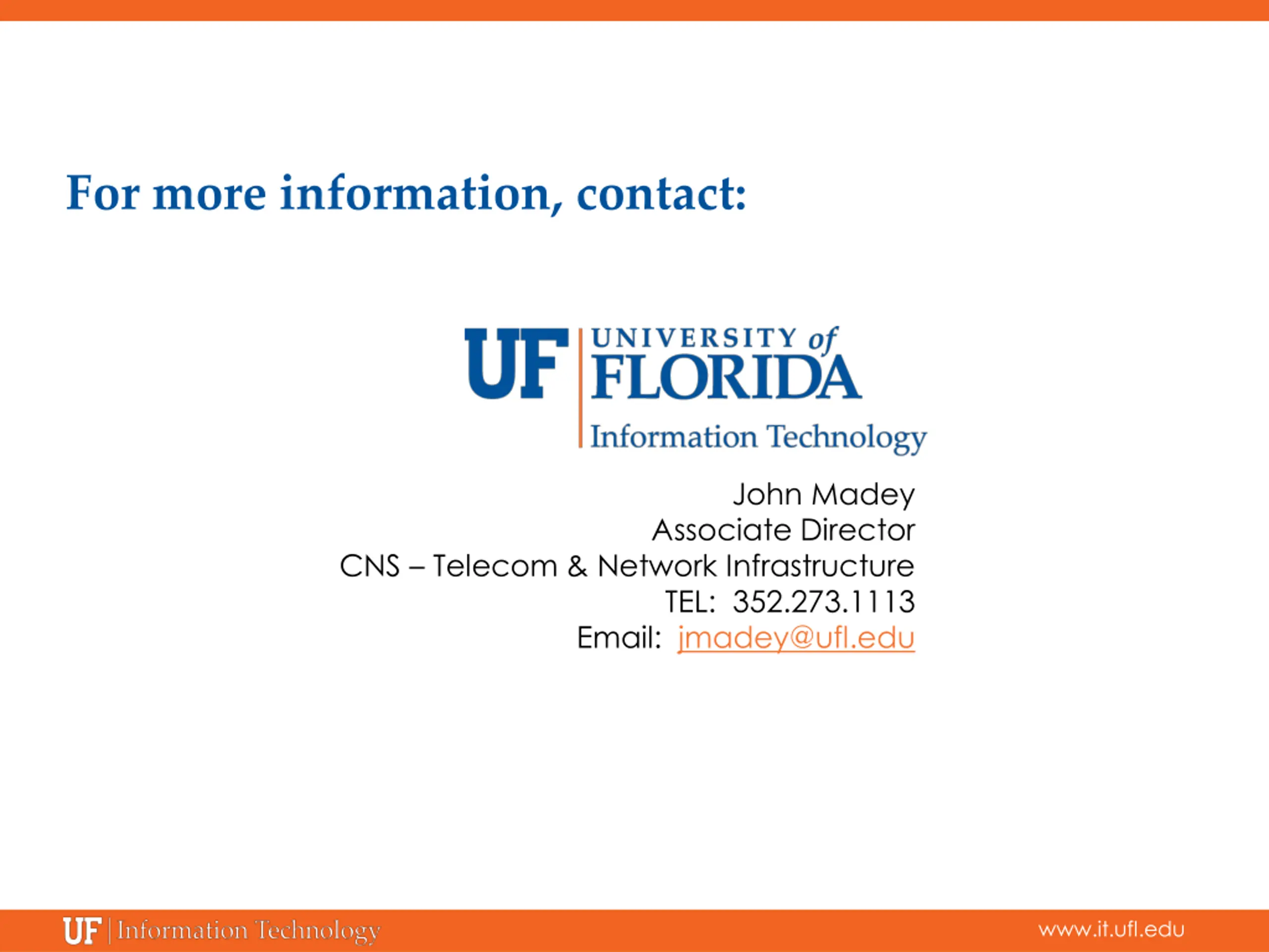For more information, contact: John Madey Associate Director CNS Telecom & Network Infrastructure TEL: 352.273.1113 Email: jmadey@ufl.edu www.it.ufl.edu