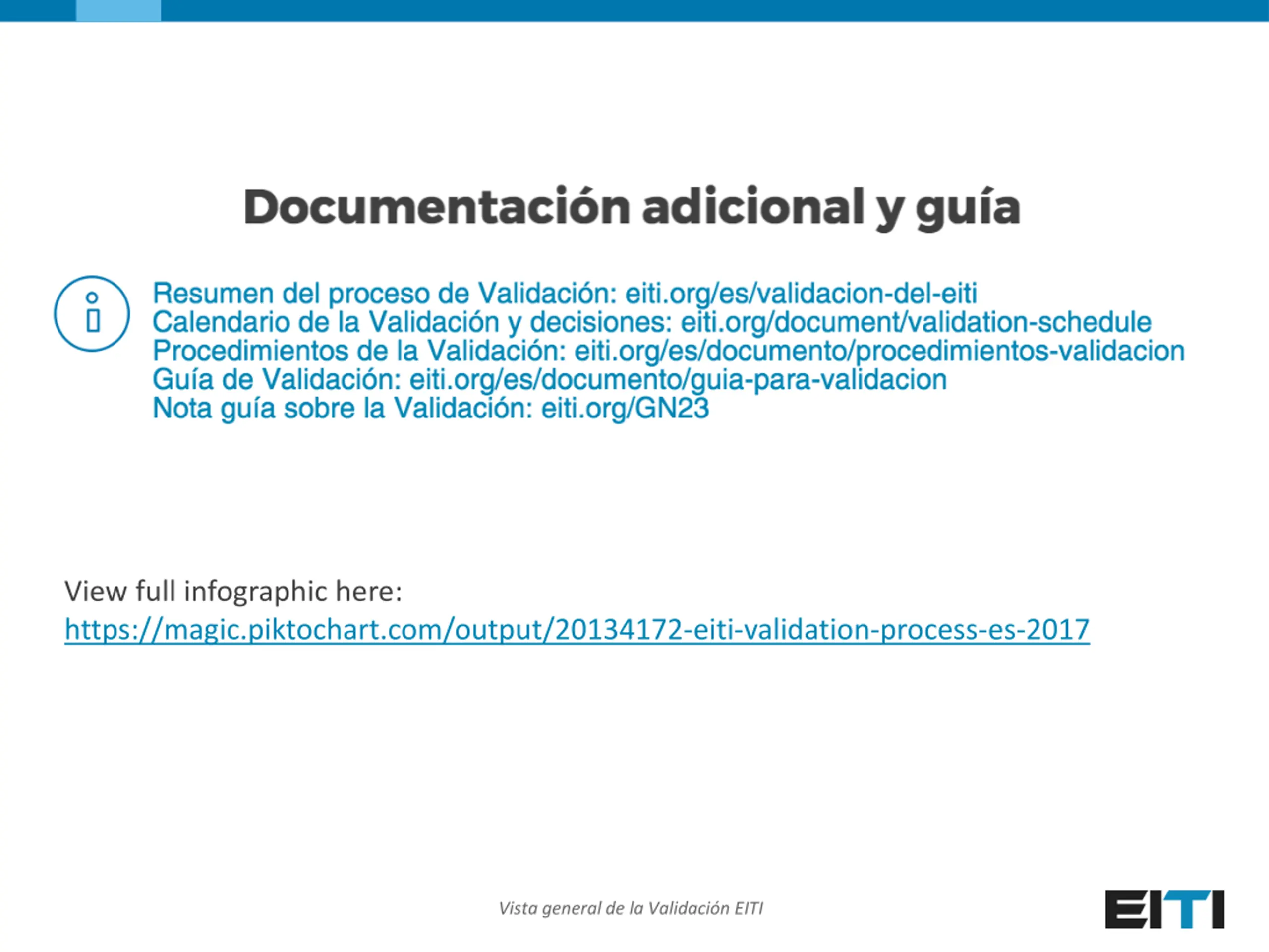 Link to infographic: https://magic.piktochart.com/output/14849048-vista-general-de-la-validacion-eiti View full infographic here: https://magic.piktochart.com/output/20134172-eiti-validation-process-es-2017 Vista general de la Validaci n EITI