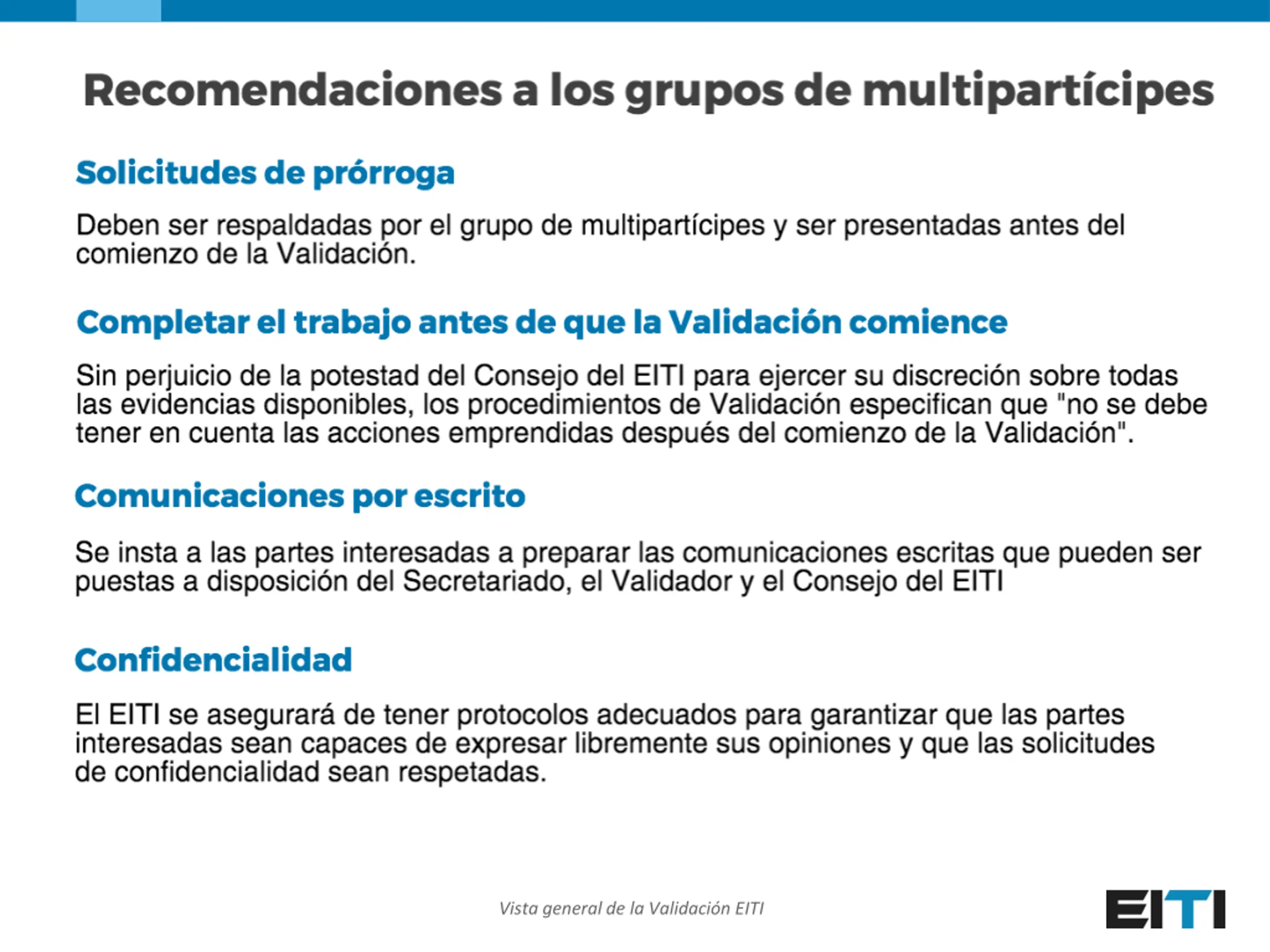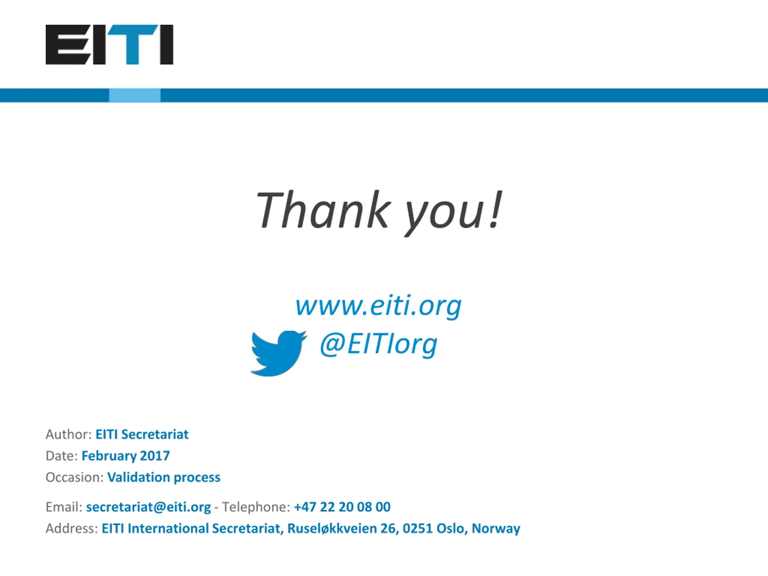 Thank you! www.eiti.org @EITIorg Author: EITI Secretariat Date: February 2017 Occasion: Validation process Email: secretariat@eiti.org - Telephone: +47 22 20 08 00 Address: EITI International Secretariat, Rusel kkveien 26, 0251 Oslo, Norway Vista general de la Validaci n EITI