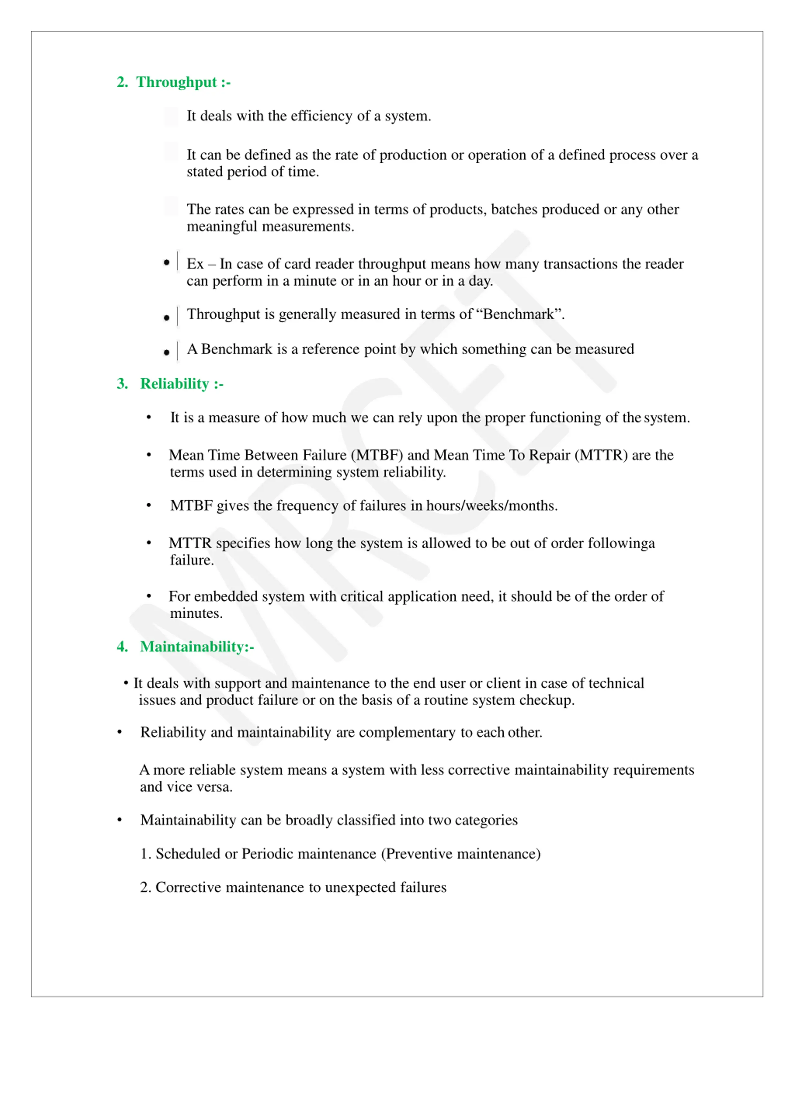2. Throughput :- It deals with the efficiency of a system. It can be defined as the rate of production or operation of a defined process over a stated period of time. The rates can be expressed in terms of products, batches produced or any other meaningful measurements. Ex In case of card reader throughput means how many transactions the reader can perform in a minute or in an hour or in a day. Throughput is generally measured in terms of Benchmark . A Benchmark is a reference point by which something can be measured 3. Reliability :- It is a measure of how much we can rely upon the proper functioning of thesystem. Mean Time Between Failure (MTBF) and Mean Time To Repair (MTTR) are the terms used in determining system reliability. MTBF gives the frequency of failures in hours/weeks/months. MTTR specifies how long the system is allowed to be out of order followinga failure. For embedded system with critical application need, it should be of the order of minutes. 4. Maintainability:- It deals with support and maintenance to the end user or client in case of technical issues and product failure or on the basis of a routine system checkup. Reliability and maintainability are complementary to eachother. A more reliable system means a system with less corrective maintainability requirements and vice versa. Maintainability can be broadly classified into two categories 1. Scheduled or Periodic maintenance (Preventive maintenance) 2. Corrective maintenance to unexpected failures