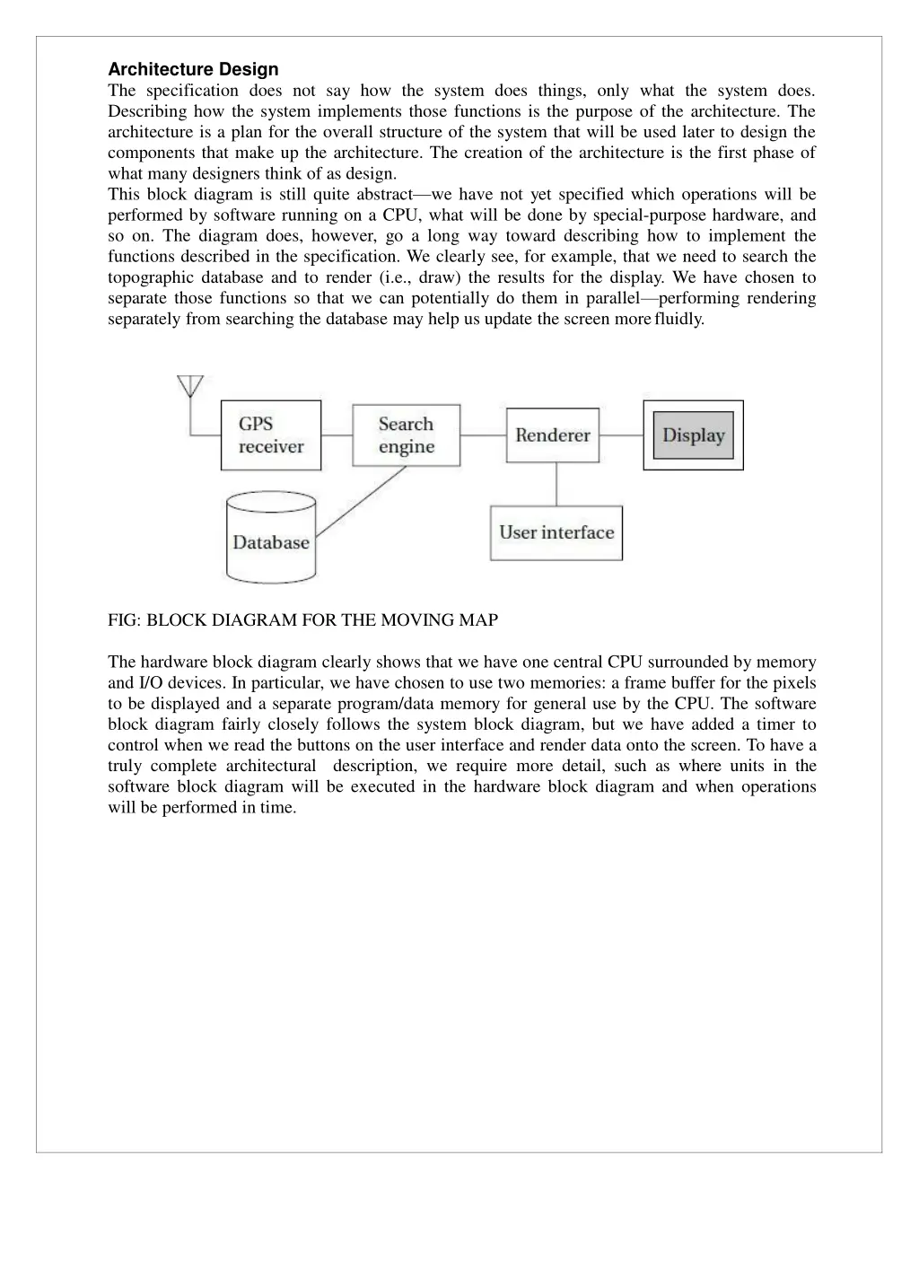 Architecture Design The specification does not say how the system does things, only what the system does. Describing how the system implements those functions is the purpose of the architecture. The architecture is a plan for the overall structure of the system that will be used later to design the components that make up the architecture. The creation of the architecture is the first phase of what many designers think of as design. This block diagram is still quite abstract we have not yet specified which operations will be performed by software running on a CPU, what will be done by special-purpose hardware, and so on. The diagram does, however, go a long way toward describing how to implement the functions described in the specification. We clearly see, for example, that we need to search the topographic database and to render (i.e., draw) the results for the display. We have chosen to separate those functions so that we can potentially do them in parallel performing rendering separately from searching the database may help us update the screen morefluidly. FIG: BLOCK DIAGRAM FOR THE MOVING MAP The hardware block diagram clearly shows that we have one central CPU surrounded by memory and I/O devices. In particular, we have chosen to use two memories: a frame buffer for the pixels to be displayed and a separate program/data memory for general use by the CPU. The software block diagram fairly closely follows the system block diagram, but we have added a timer to control when we read the buttons on the user interface and render data onto the screen. To have a truly complete architectural description, we require more detail, such as where units in the software block diagram will be executed in the hardware block diagram and when operations will be performed in time.
