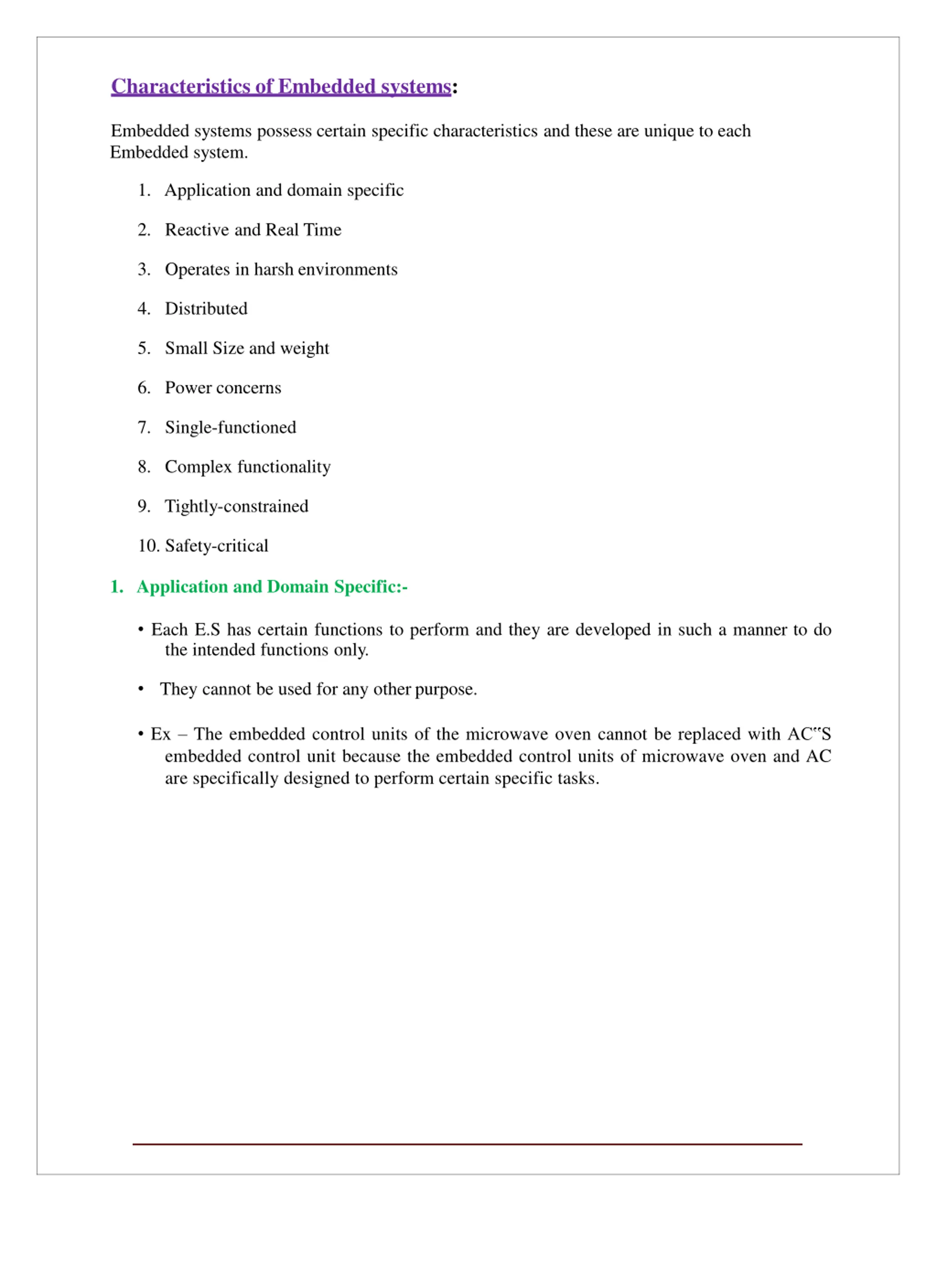 Characteristics of Embedded systems: Embedded systems possess certain specific characteristics and these are unique to each Embedded system. 1. Application and domain specific 2. Reactive and Real Time 3. Operates in harsh environments 4. Distributed 5. Small Size and weight 6. Power concerns 7. Single-functioned 8. Complex functionality 9. Tightly-constrained 10. Safety-critical 1. Application and Domain Specific:- Each E.S has certain functions to perform and they are developed in such a manner to do the intended functions only. They cannot be used for any other purpose. Ex The embedded control units of the microwave oven cannot be replaced with AC S embedded control unit because the embedded control units of microwave oven and AC are specifically designed to perform certain specific tasks.